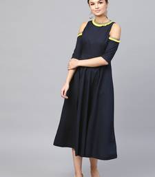 | Product Description | Navy Cold Shoulder Dress, In Cotton Fabric, Unlined, Full Length, Fit And Flare, Zipper Closure, Straight Hemline And Features Fringe Lace On Neck And Shoulder |