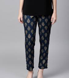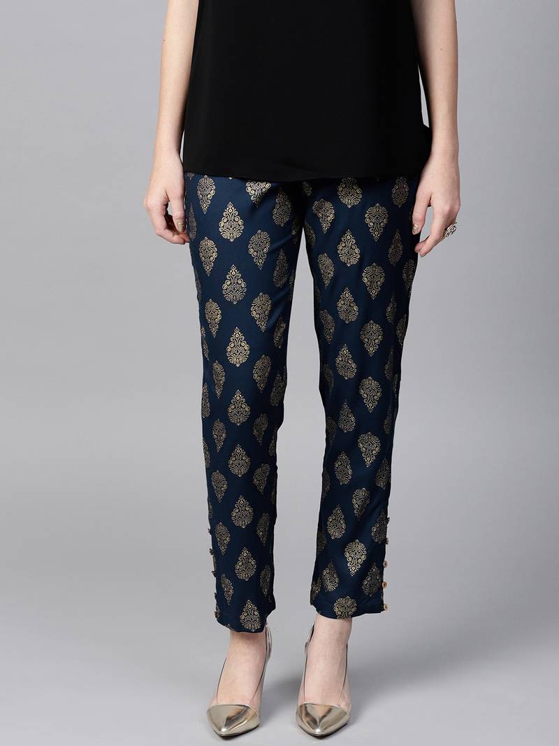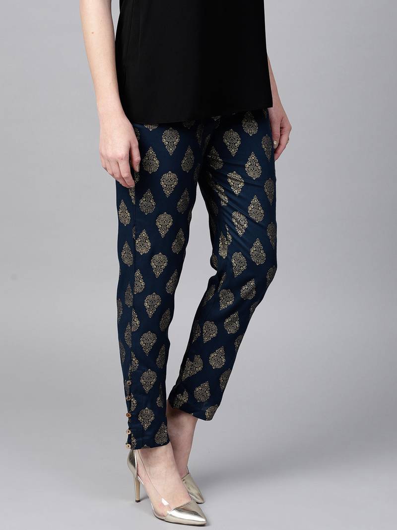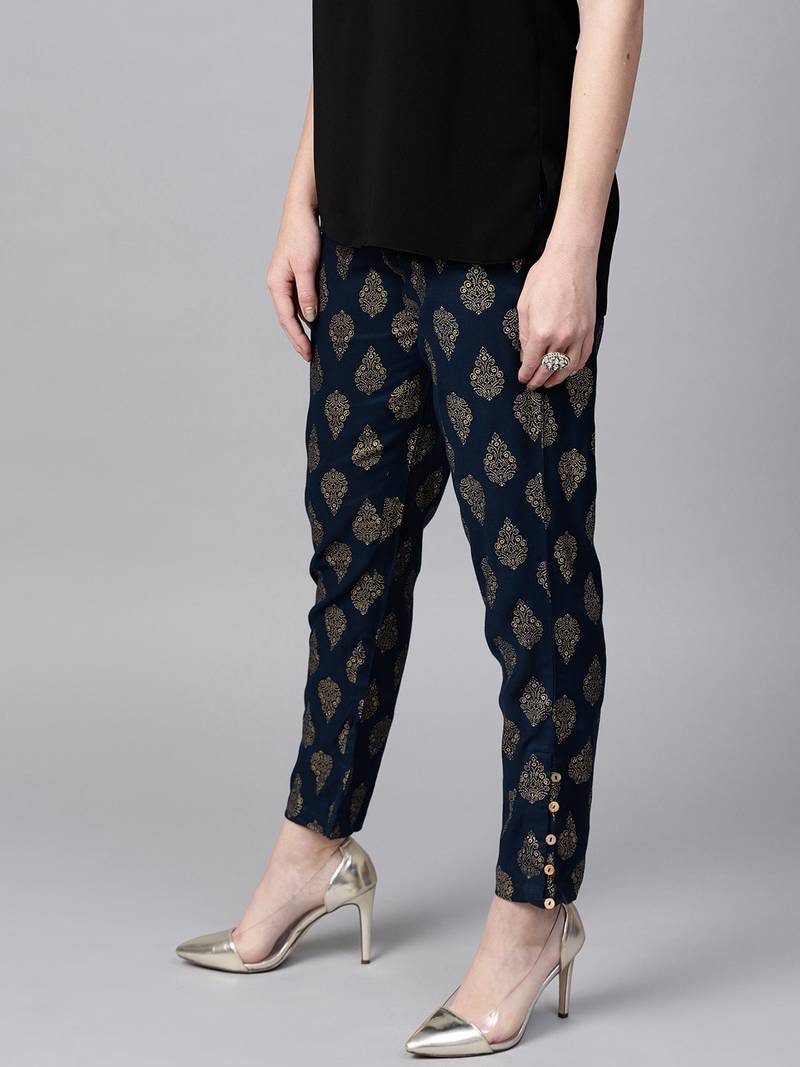 | Product Description | Navy Foil Print Pencil Pants, In Rayon Fabric, Unlined, Ankle Length, Tapered Fit, Elasticated Waist Line , Tapered Hemline And Features Button On Out Seam |