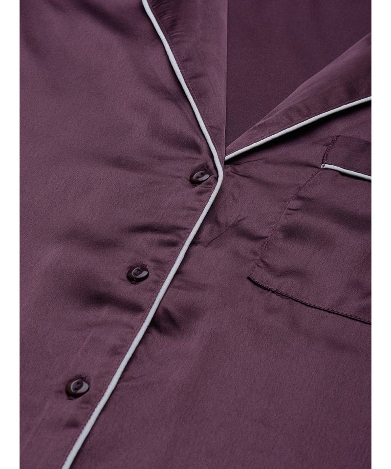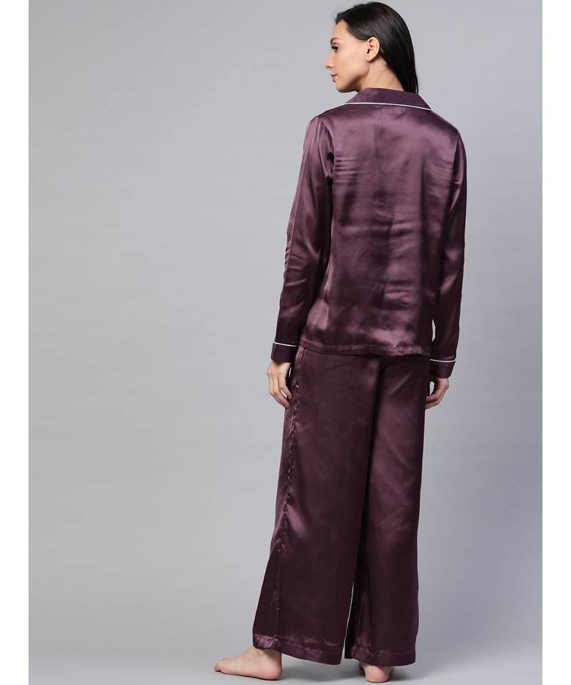 | Product Description | Purple Satin Night Suit, In Satin Fabric, Unlined, Regular Length, Comfort Fit, Top Button Closure, Bottom Elasticated Waistband, Straight Hemline And Features Contrast Piping Detail At Collar, Cuff And Placket |