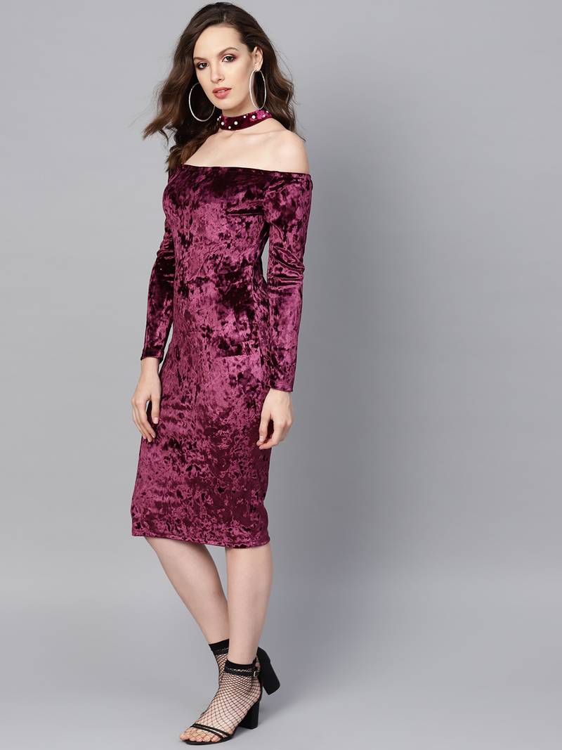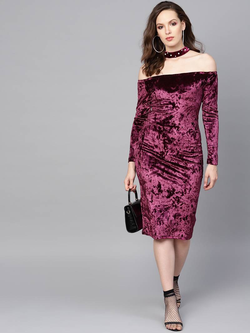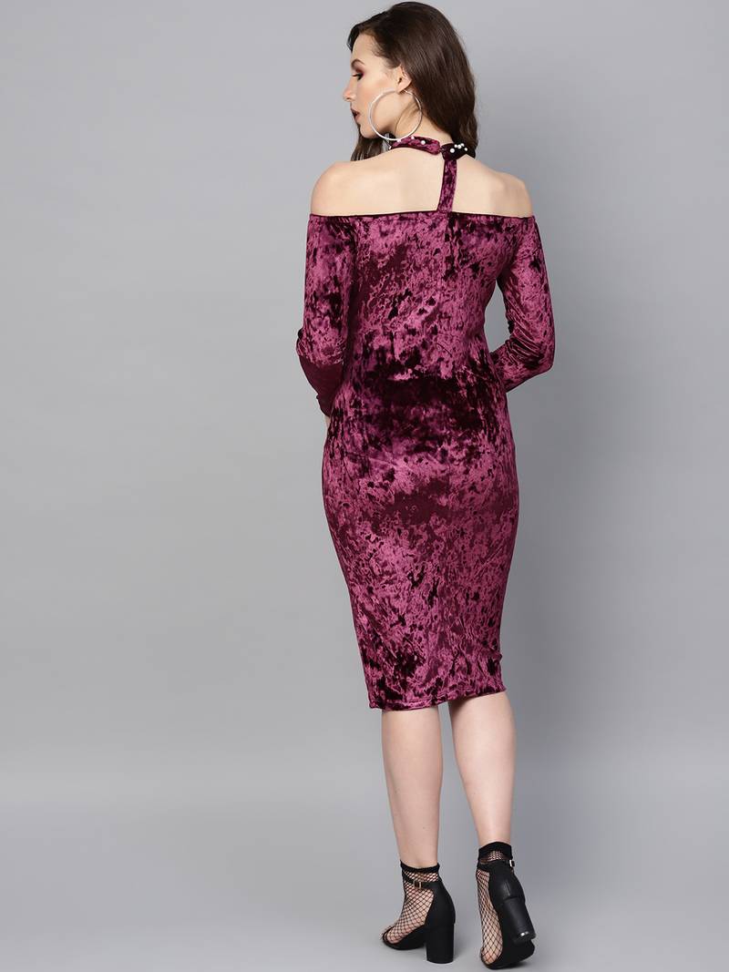 | Product Description | Purple Velvet Choker Bodycon Dress, In Velvet Fabric, Unlined, Knee Length, Slim Fit, Button Closure, Straight Hemline And Features Pearl Detail On Choker Band |