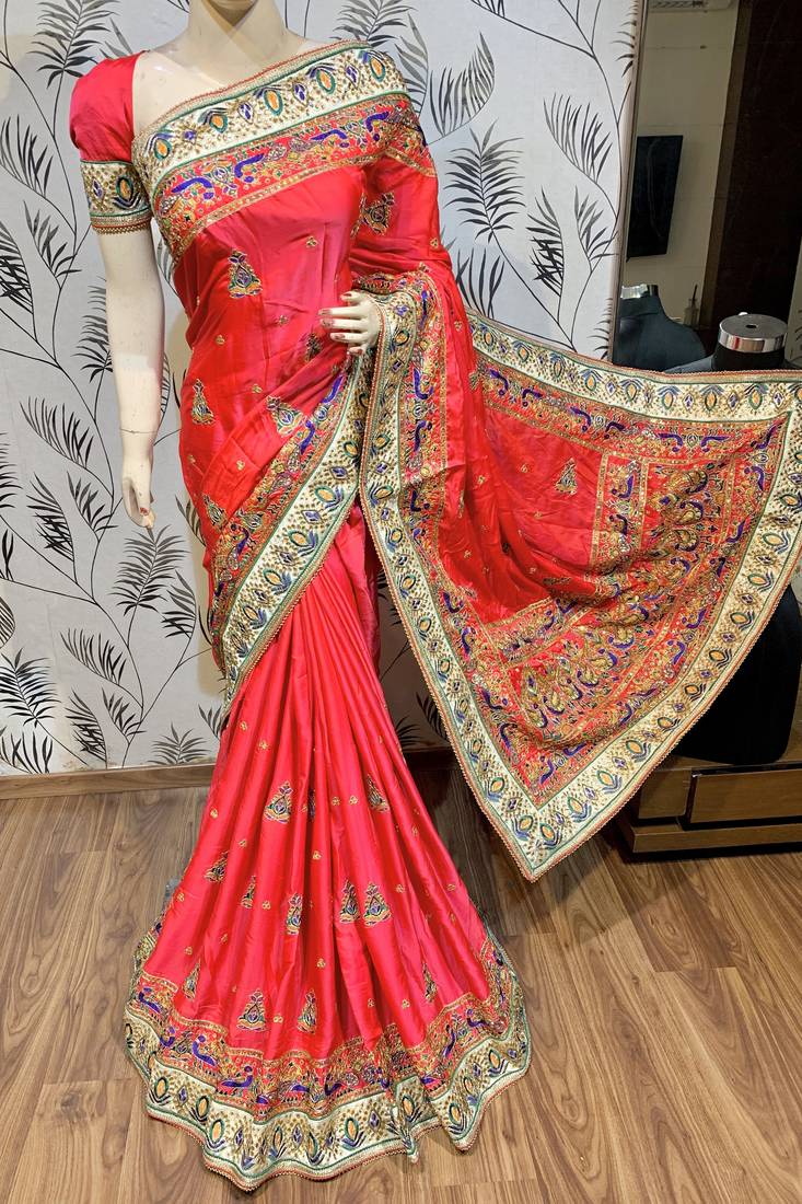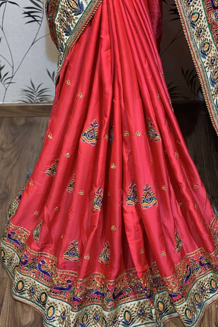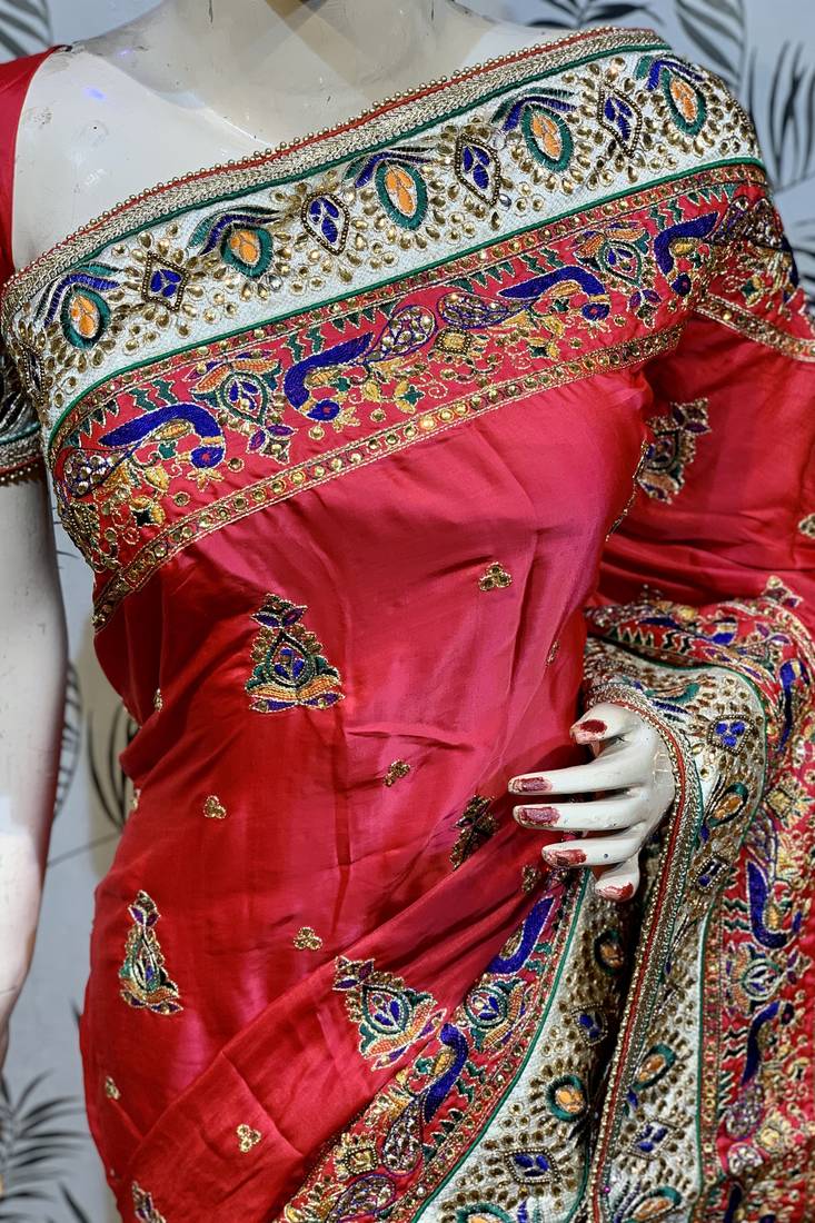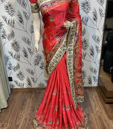 Pure silk wedding wear saree in red with embroidery work & handwork
