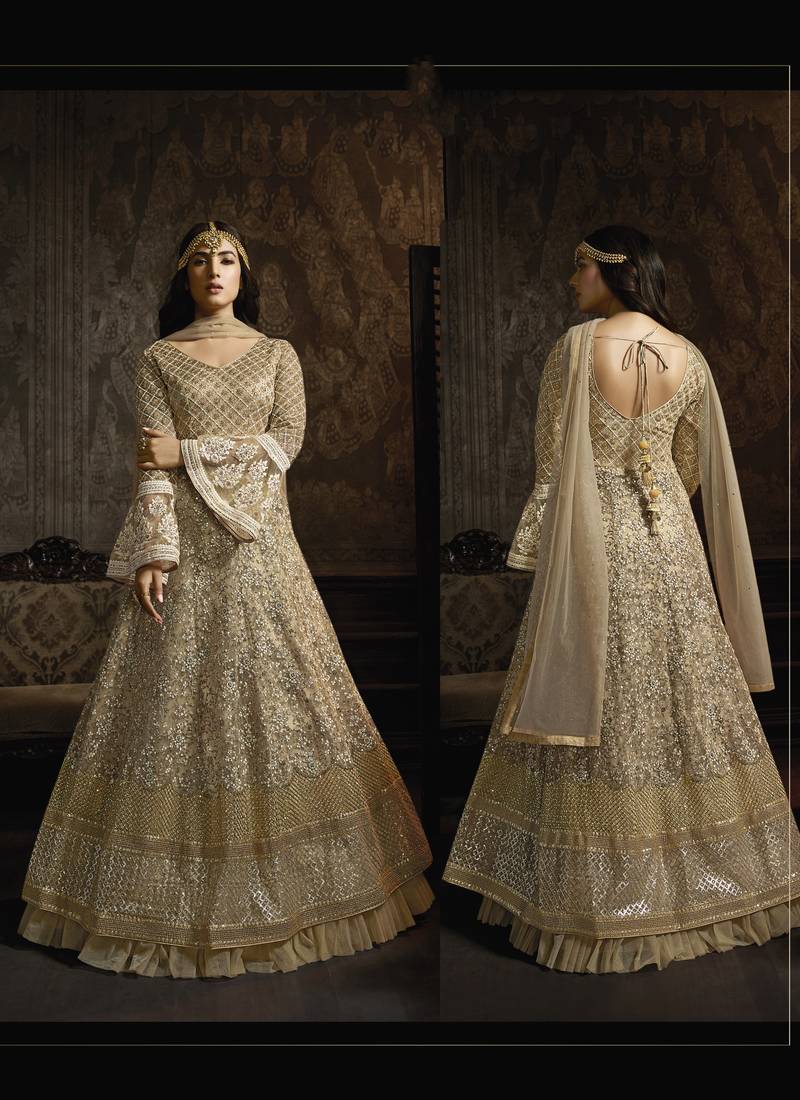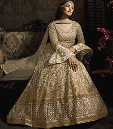 Golden net wedding gown with embroidery, sequins, and crystal work semi stitched