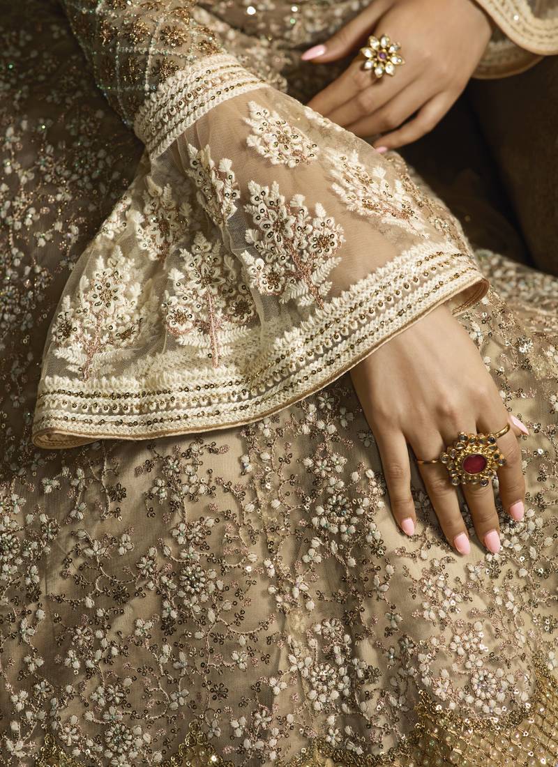 | Product Name | Golden Net Wedding Gown With Embroidery, Sequins, And Crystal Work | |