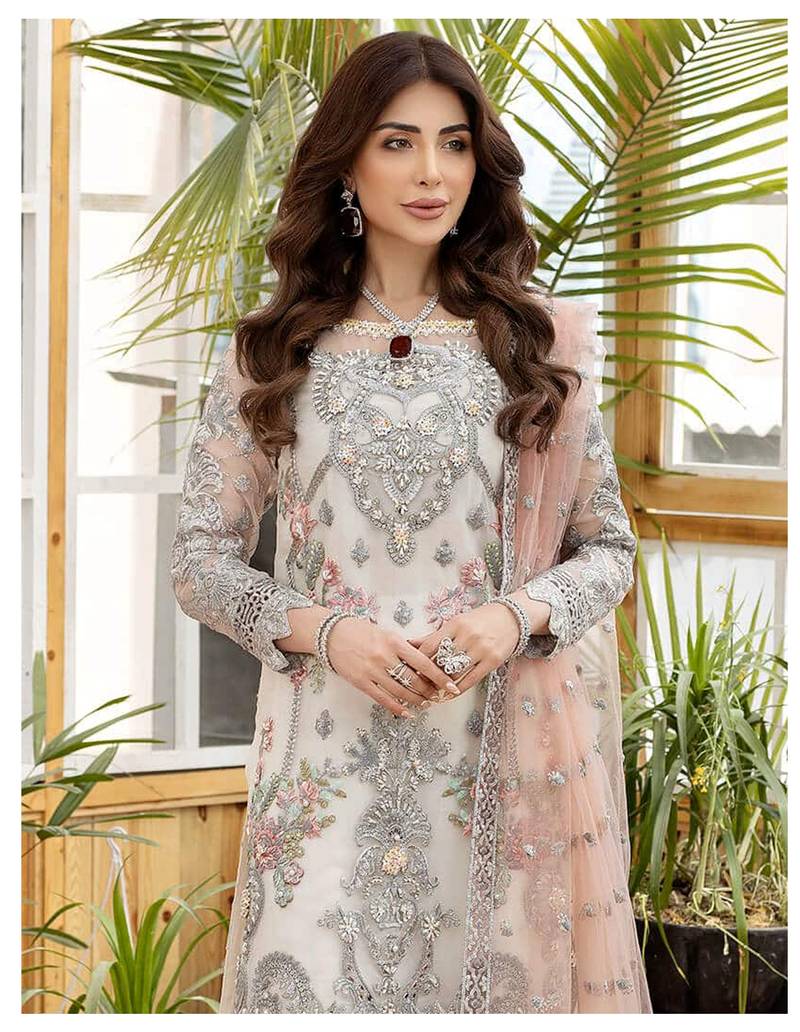 | Product Name | White Semi Stitched Heavy Pakistani Embroidery Worked Suite In Butterfly Net | |