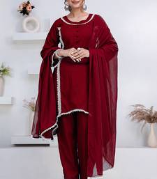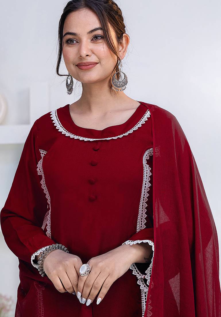 | Product Description | Women Maroon Rayon Lace Button Stiched Full Sleeve U Neck Party Wear A Line Kurta Set |