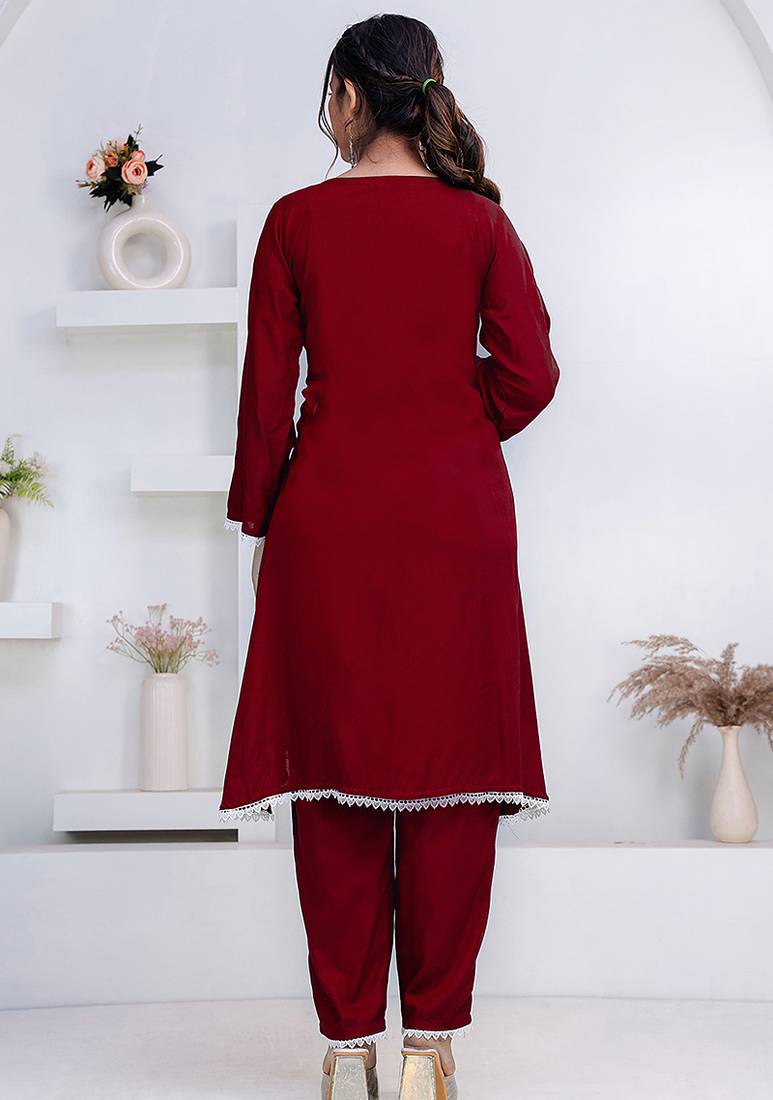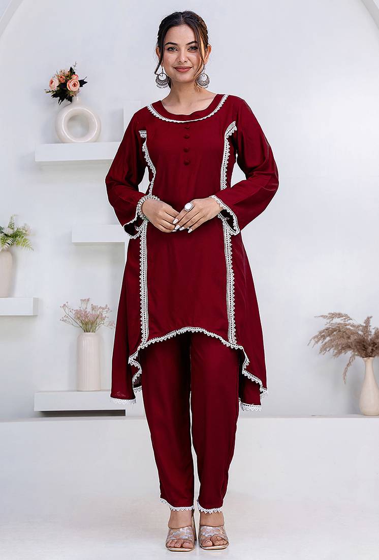 | Product Name | Maroon Lace Button Solid Rayon Stitched A Line Pant Suit Set | |