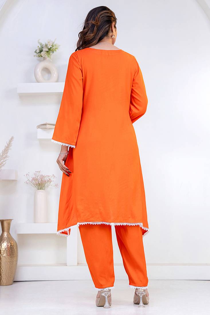 | Product Description | Women Orange Rayon Lace Button Stiched Full Sleeve U Neck Party Wear A Line Kurta Set |