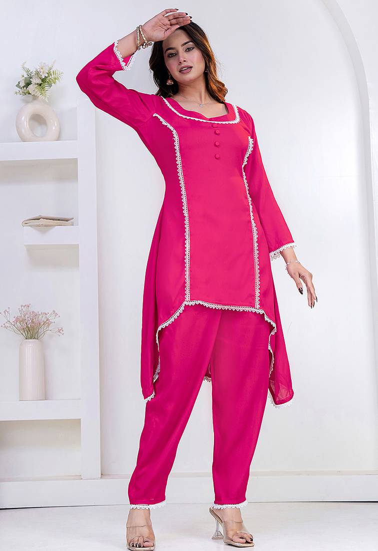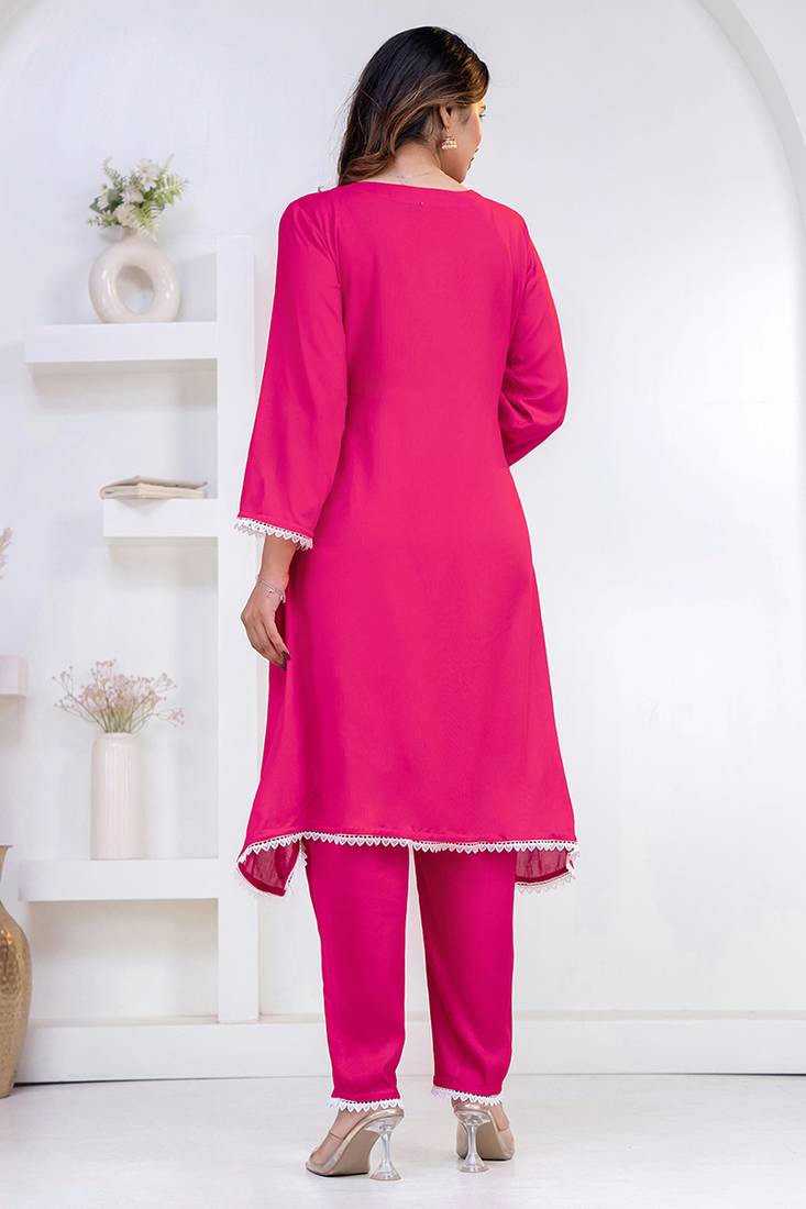 | Product Name | Pink Lace Button Solid Rayon Stitched A Line Pant Suit Set | |