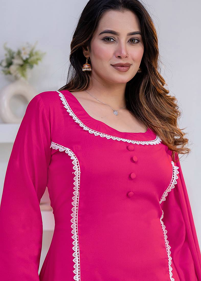 | Product Description | Women Pink Rayon Lace Button Stiched Full Sleeve U Neck Party Wear A Line Kurta Set |