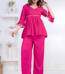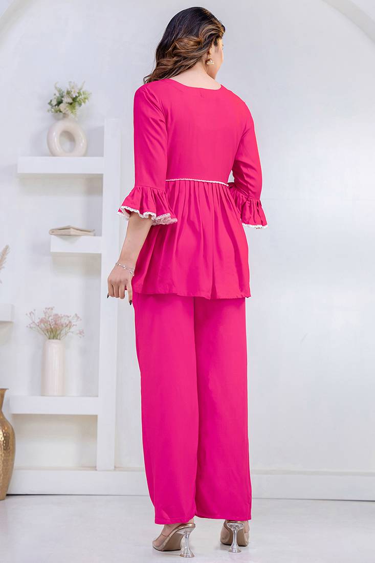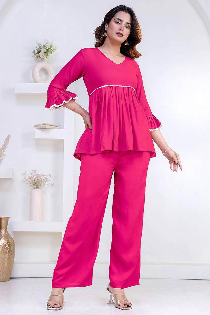 Turn Heads With This Vibrant Pink Flared Co Ord Set, Designed To Bring A Perfect Mix Of Comfort And Style To Your Wardrobe. Crafted From Soft And Breathable Rayon Fabric, The V Neck Top Features Delicate Lace Detailing That Adds A Feminine And Elegant Touch. The Flared Silhouette Offers A Relaxed Yet Flattering Fit, While The Three Quarter Sleeves With Ruffle Accents Enhance Its Stylish Appeal. Paired With Matching Straight Fit Pants, This Outfit Ensures Ease And All Day Comfort. The Bold Pink Shade Adds A Lively And Trendy Vibe, Making It Ideal For Casual Outings, Brunches, And Festive Day Events. Lightweight And Easy To Wear, This Set Blends Modern Fashion With Everyday Elegance. Pair It With Minimal Accessories And Heels Or Flats For A Chic, Polished Look.