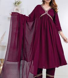 | Product Description | Women Purple Rayon Lace Stiched 3/4 Sleeve V Neck Party Wear Flared Kurta Set |