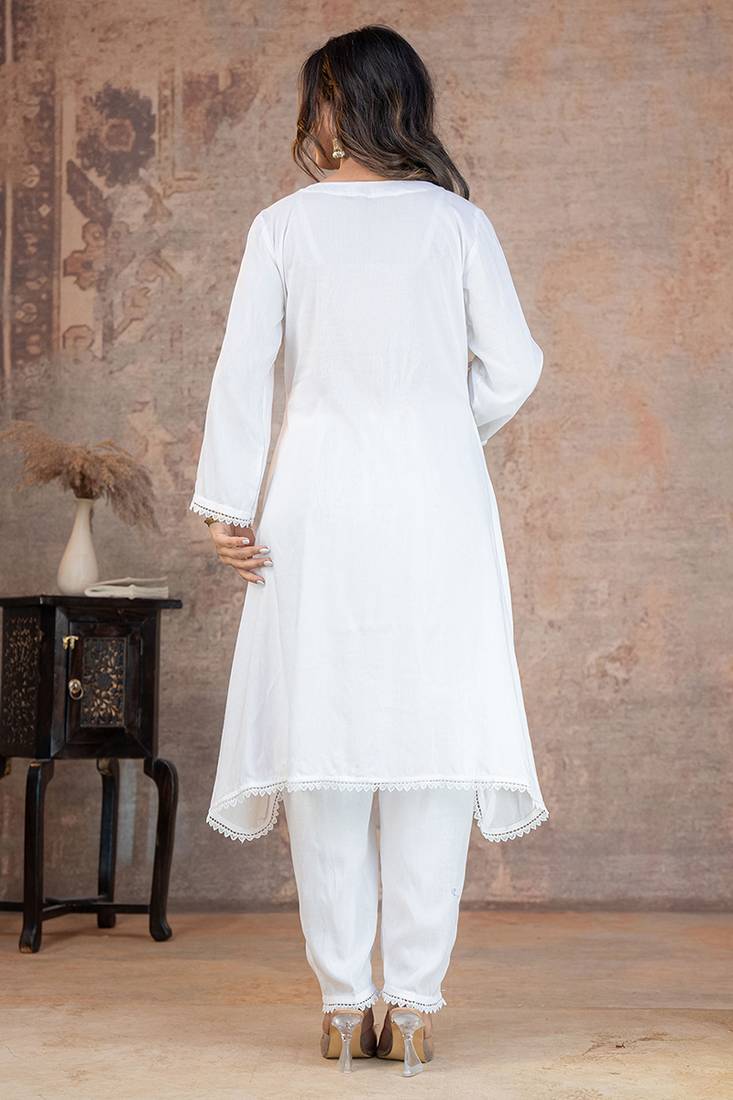 | Product Description | Women White Rayon Lace Button Stiched Full Sleeve U Neck Party Wear A Line Kurta Set |