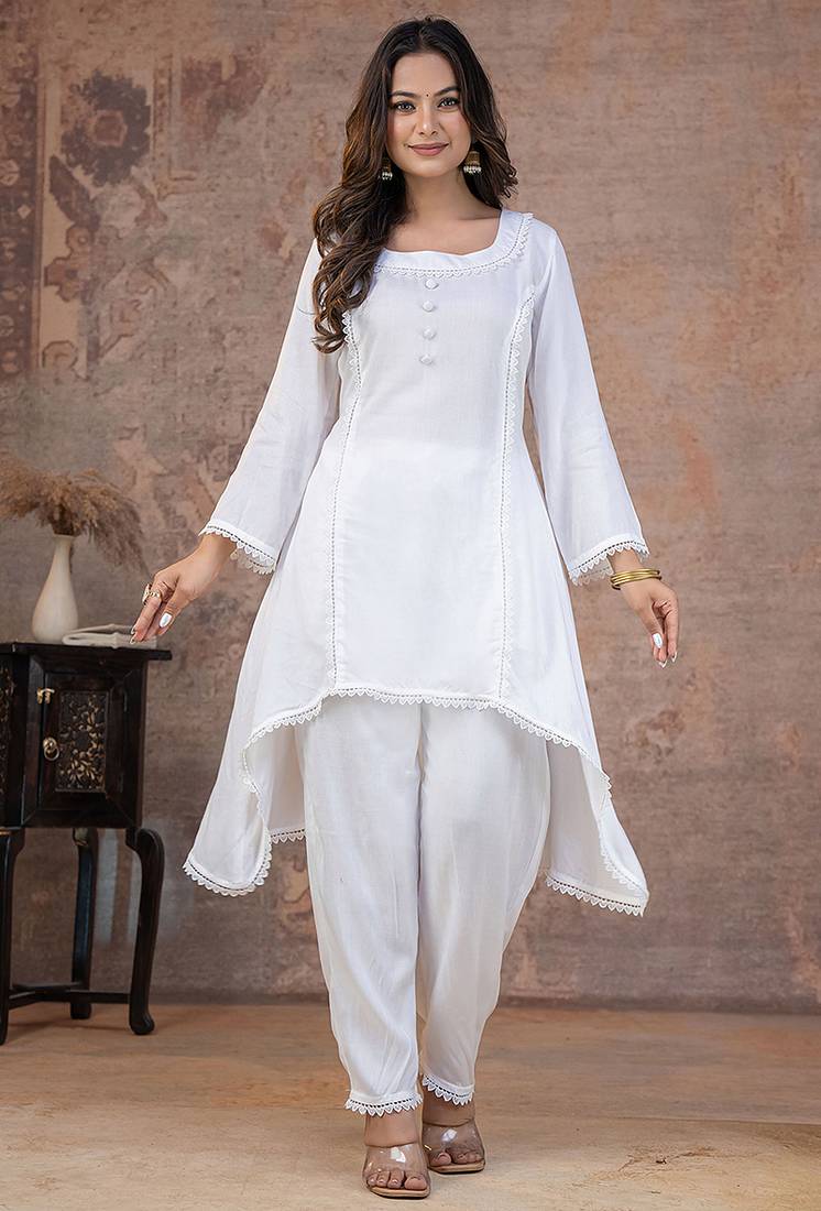 | Product Name | White Lace Button Solid Rayon Stitched A Line Pant Suit Set | |