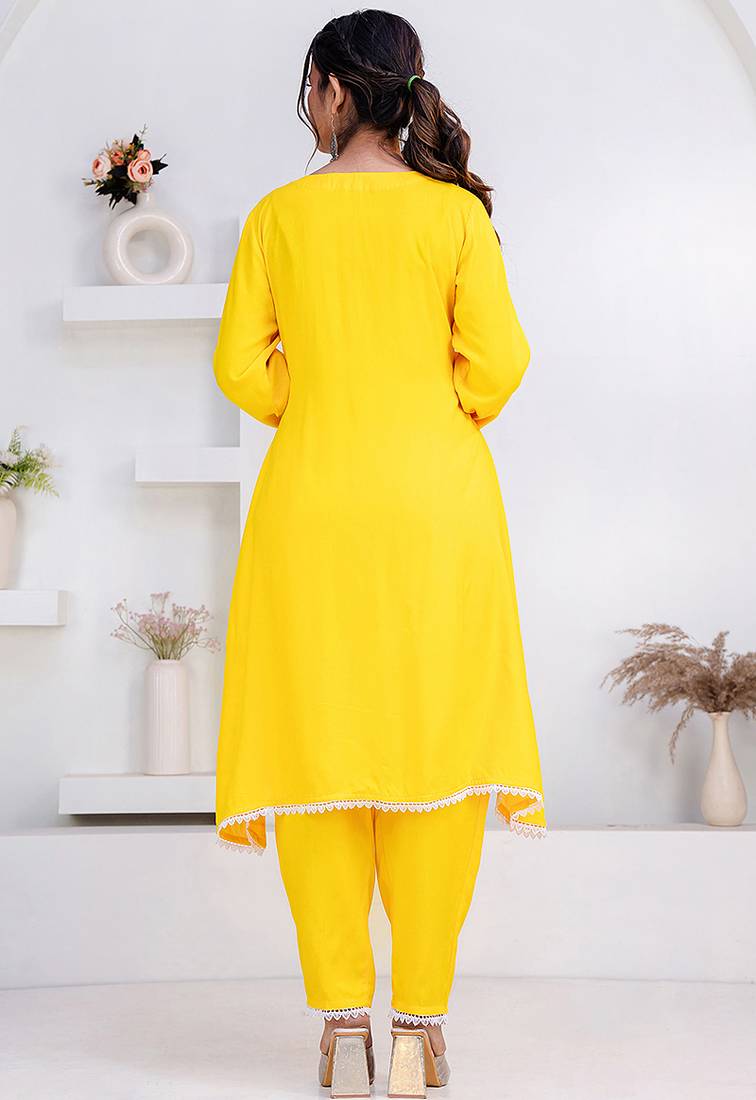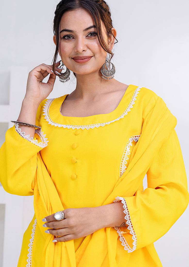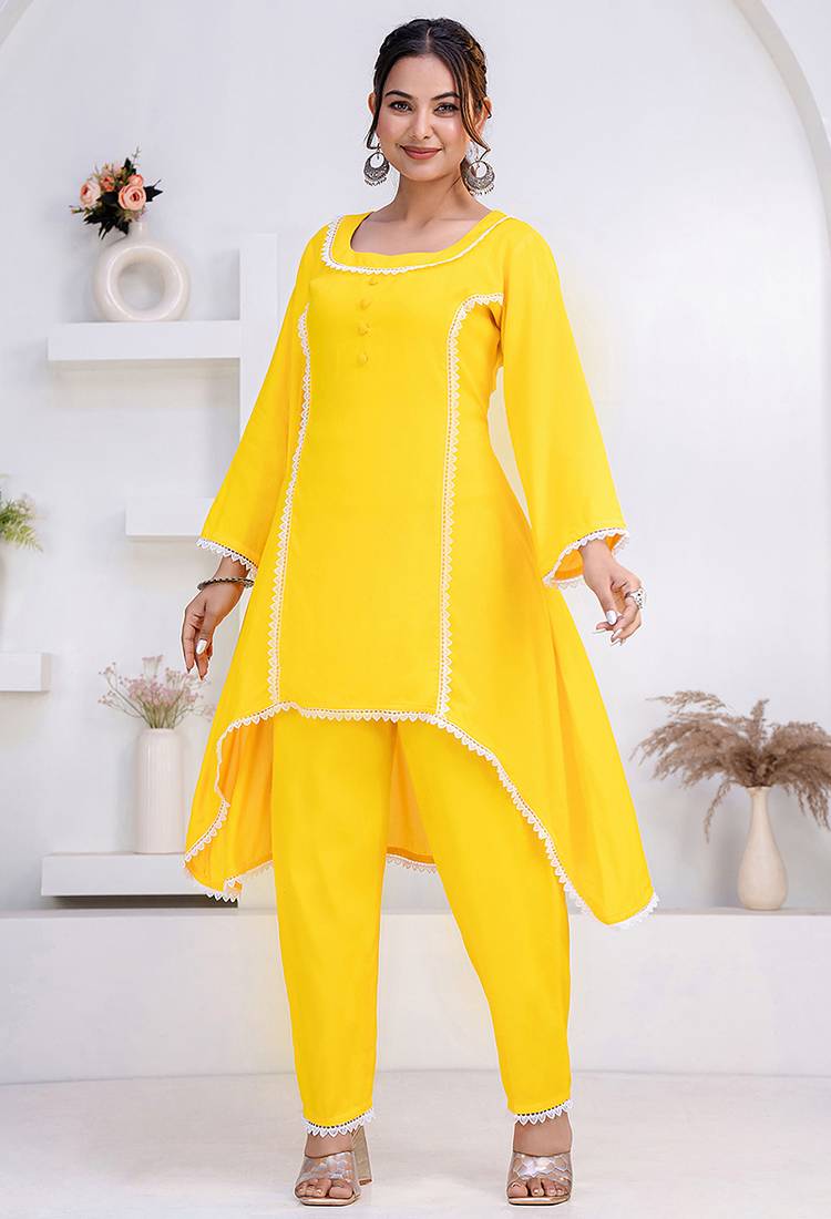 | Product Description | Women Yellow Rayon Lace Button Stiched Full Sleeve U Neck Party Wear A Line Kurta Set |