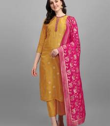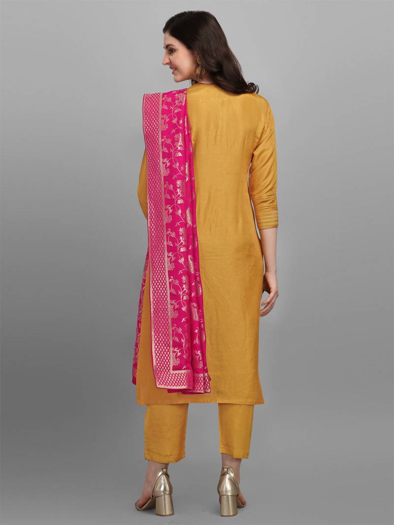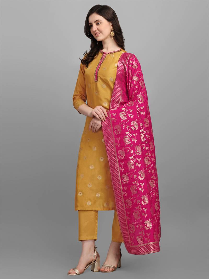 | Product Description | Mustard Zari Viscose Jacquard With Handwork Kurti With Contrast Viscose Jacquard Dupatta With Dyed Trousers |