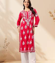 Seva chikan hand embroidered lucknowi chikankari magenta rayon kurta scl4470