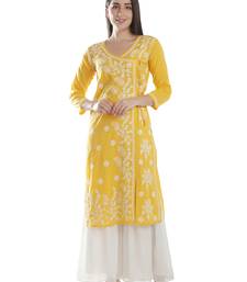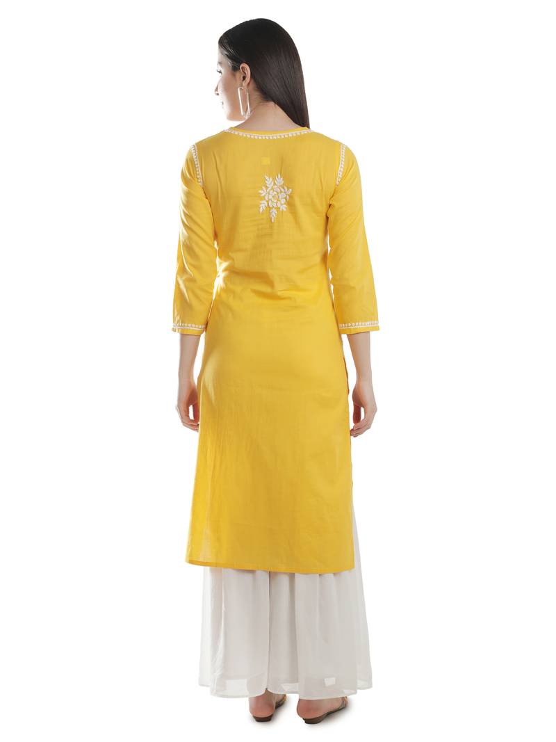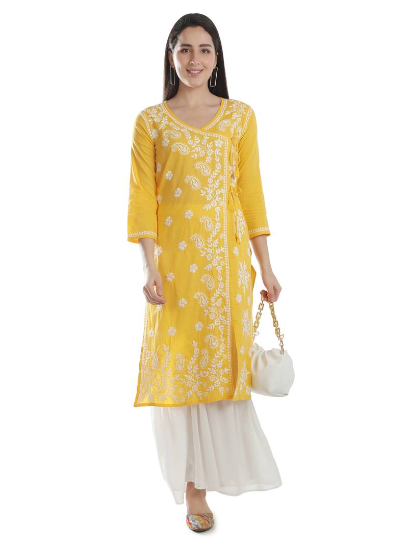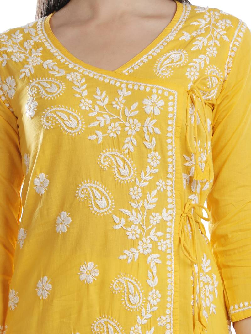 | Product Name | Seva Chikan Hand Embroidered Yellow Cotton Lucknowi Chikankari Angarkha Kurti | |