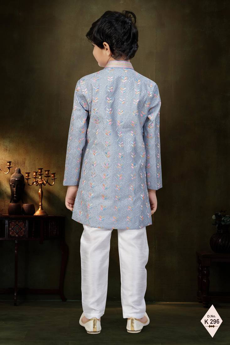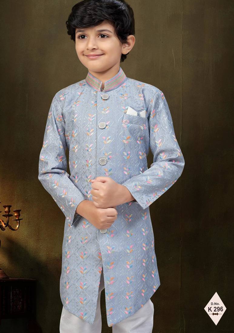 | Product Name | Grey Dupion Silk Embroidered Indo Western Set For Boys | |