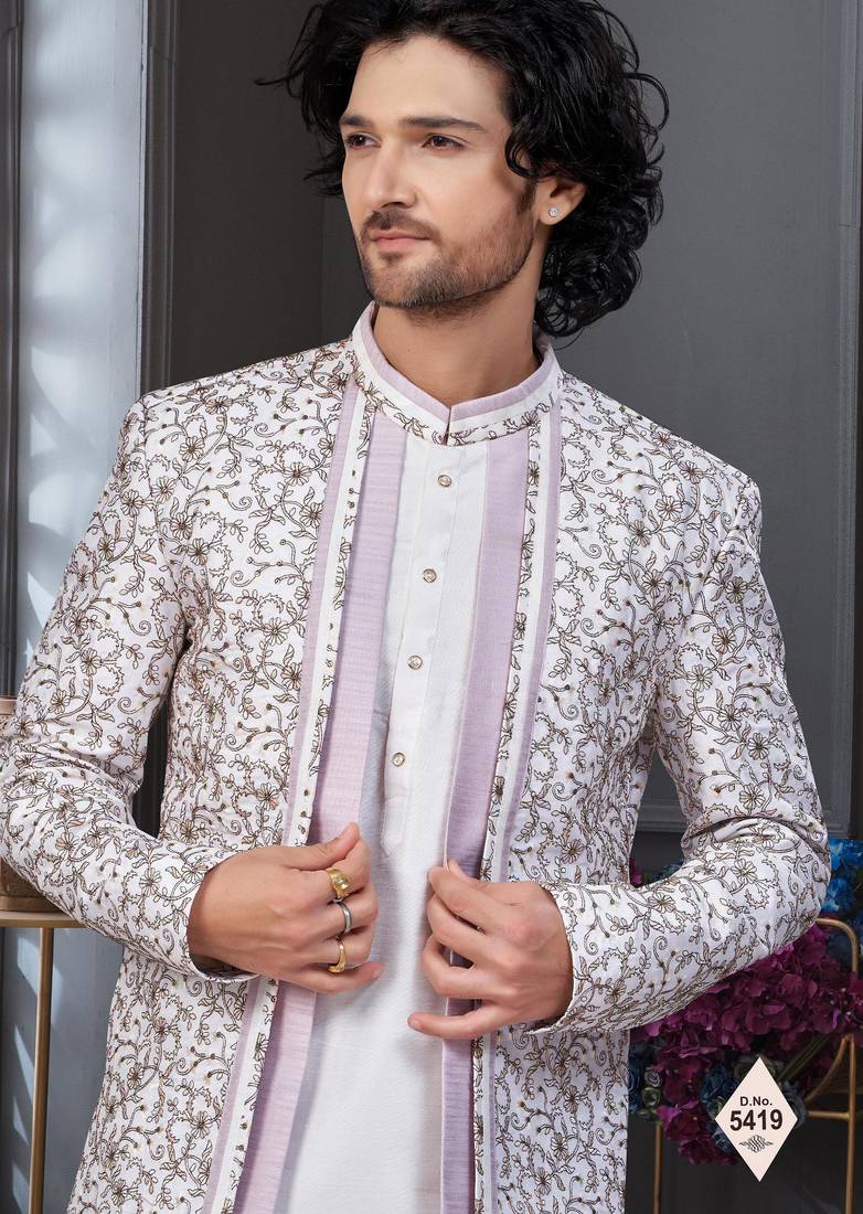 | Product Description | Full Computer Amrodery Three Palla Attached Classic Indowestern Sherwani Set With Zari Thred Work, Less Work, Stone Work & Fancy Botton |