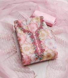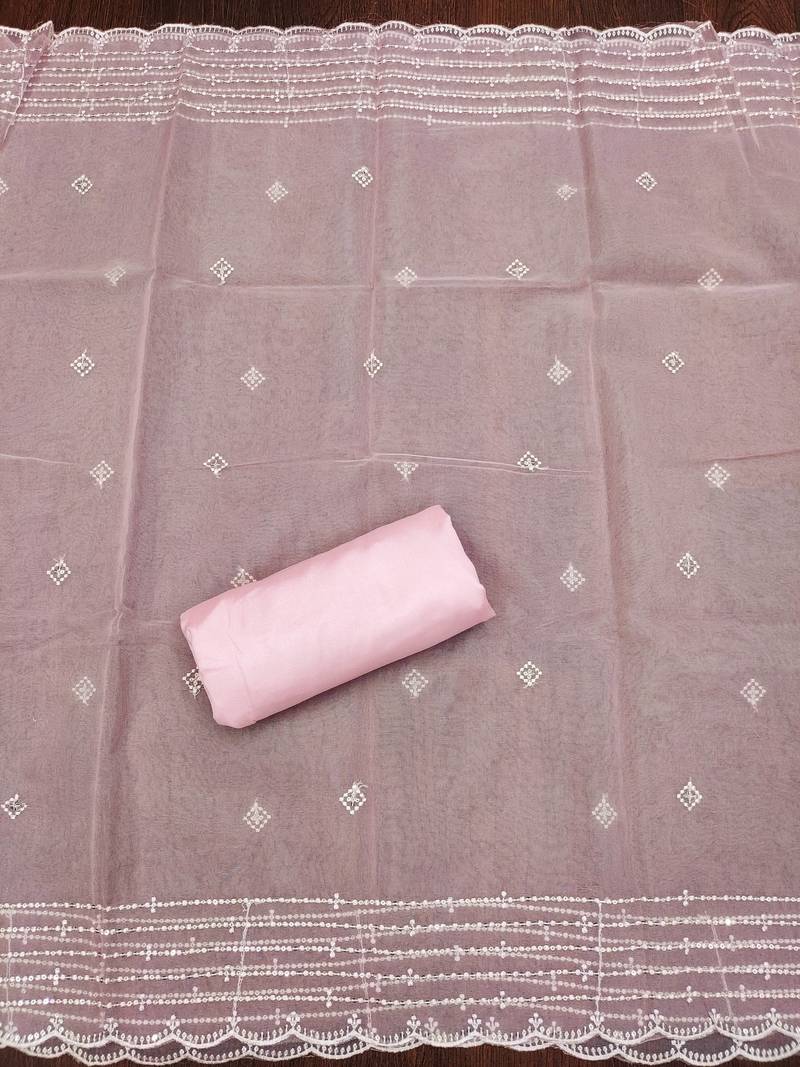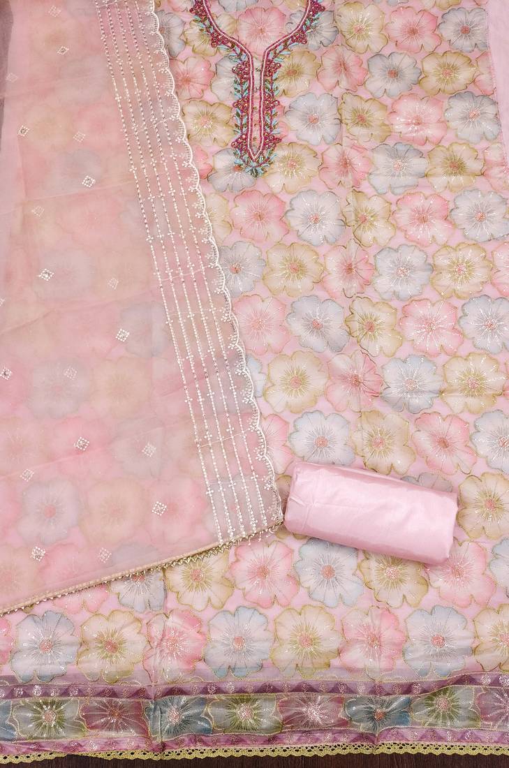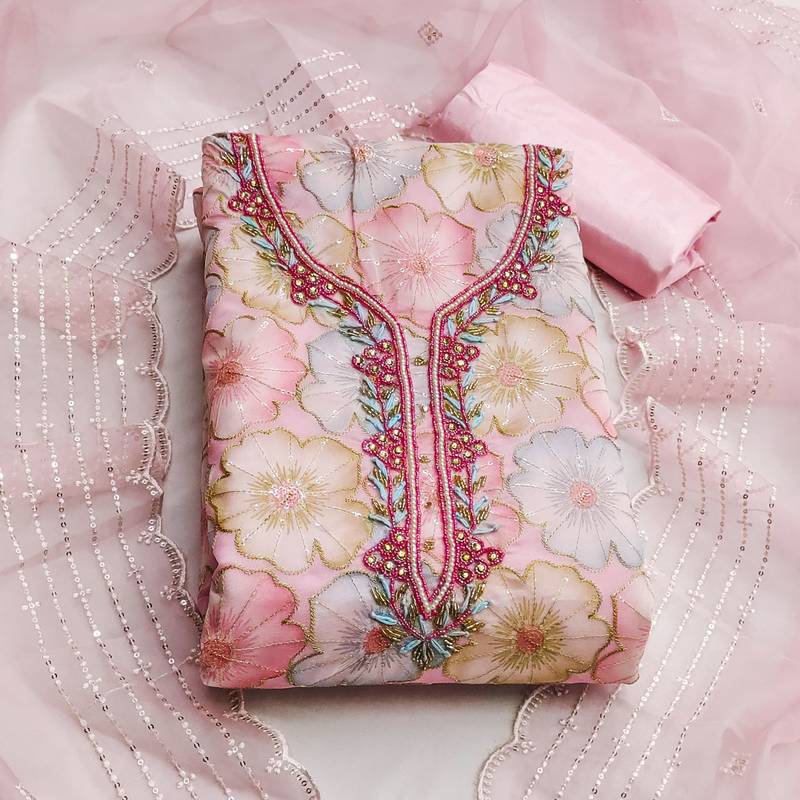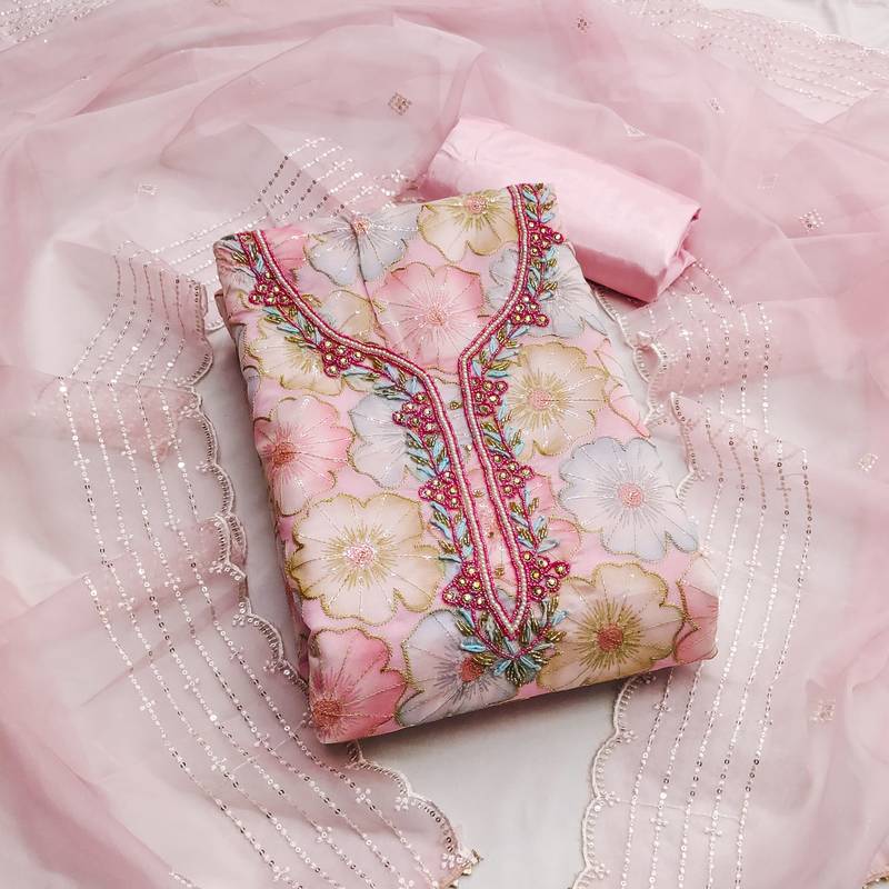 Baby pink color sequence heavy organza straight churidar dress material semi stitched