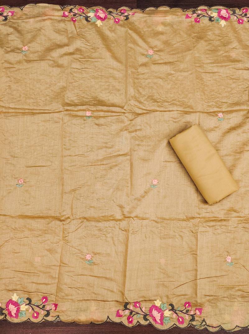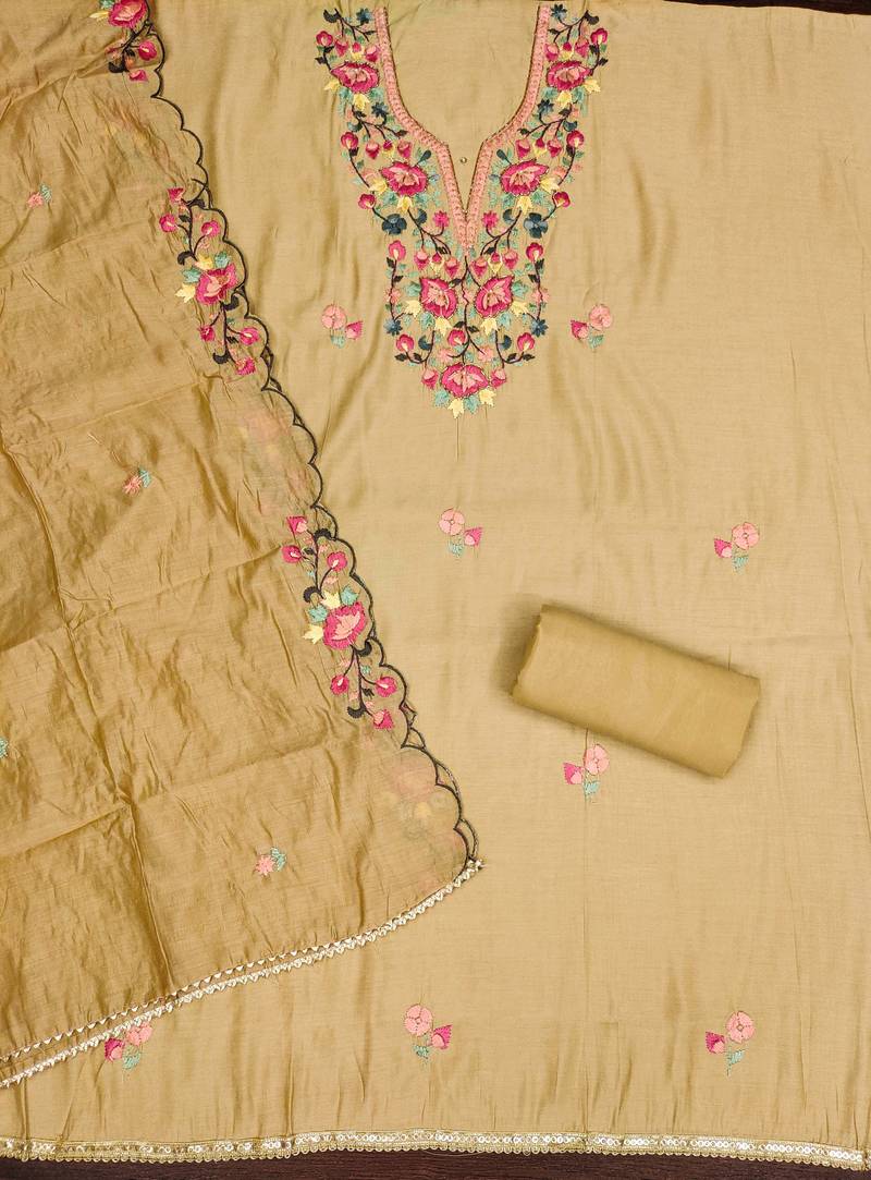 Beige color thread work roman silk straight churidar dress material semi stitched