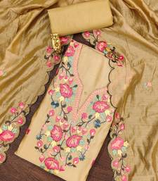 Beige thread embroidery silk blend semi stitched churidar dress-materials