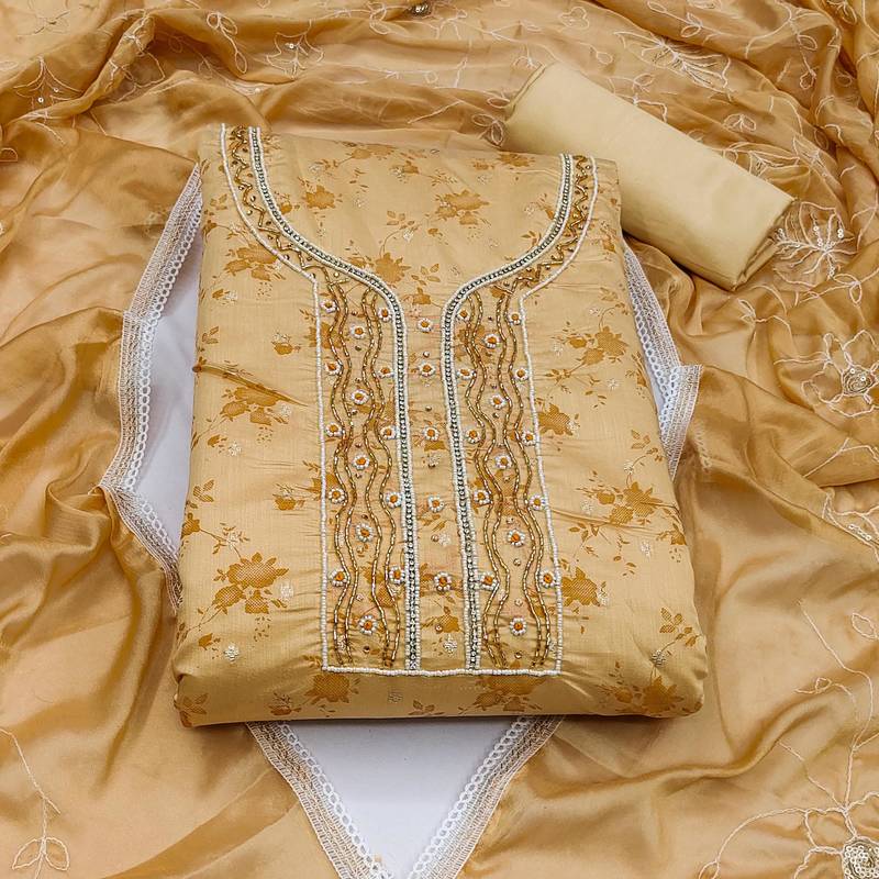 | Product Description | Handwork Digital Print And Fancy Weaving Work With Embroidery Work Dupatta Straight Style 1.95 Mtr Unstitched Dress Material Top Of Beige Colour Cotton Jacquard Fabric With 2 Mtr Heavy Santoon As Lining Inner Fabric Also Including 3.80 Mtr Unstitched Bottom Material Of Beige Colour Heavy Santoon Fabric With 2.05 Mtr Dupatta Of Beige Colour Organza Fabric |