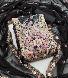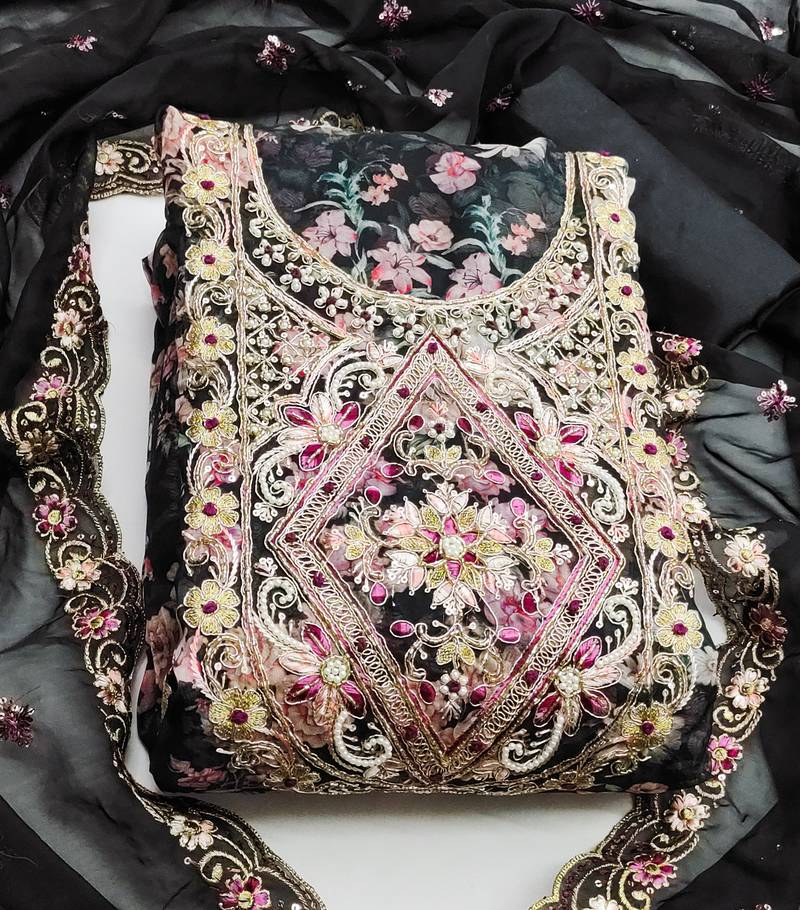 Black color hand work heavy organza straight churidar dress material semi stitched