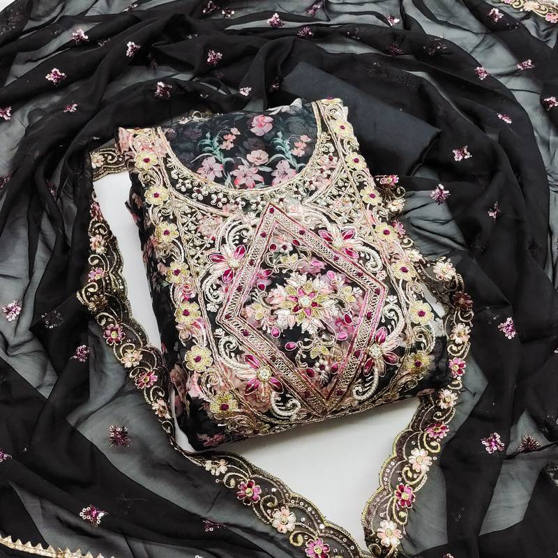 | Product Description | Fancy Stylish Handwork, Designer Digital Print And Fancy Border With Heavy Sequence Work Dupatta Straight Style 2.20 Mtr Unstitched Dress Material Top Of Black Colour Heavy Organja Fabric With 2 Mtr Heavy Santoon As Lining Inner Fabric Also Including 3.80 Mtr Unstiched Bottom Material Of Black Colour Heavy Santoon Fabric With 2.20 Mtr Dupatta Of Black Colour Heavy Organja Fabric By Shadow & Saining Brand |