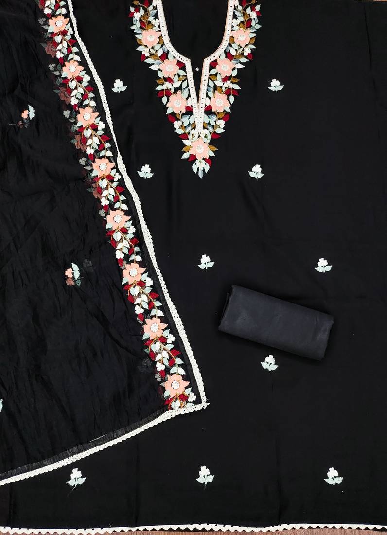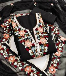 Black color thread work heavy roman silk straight churidar dress material semi stitched