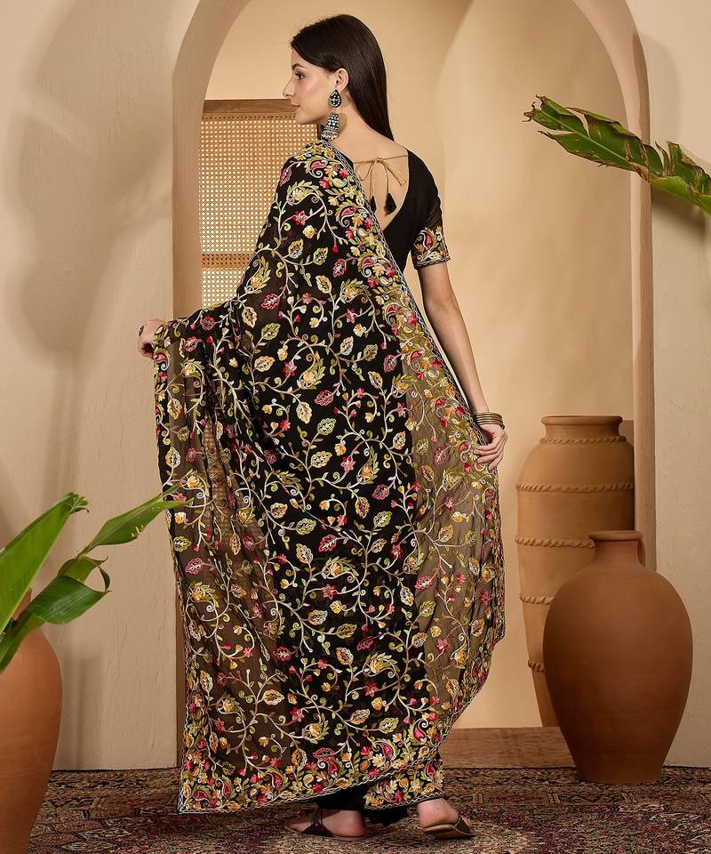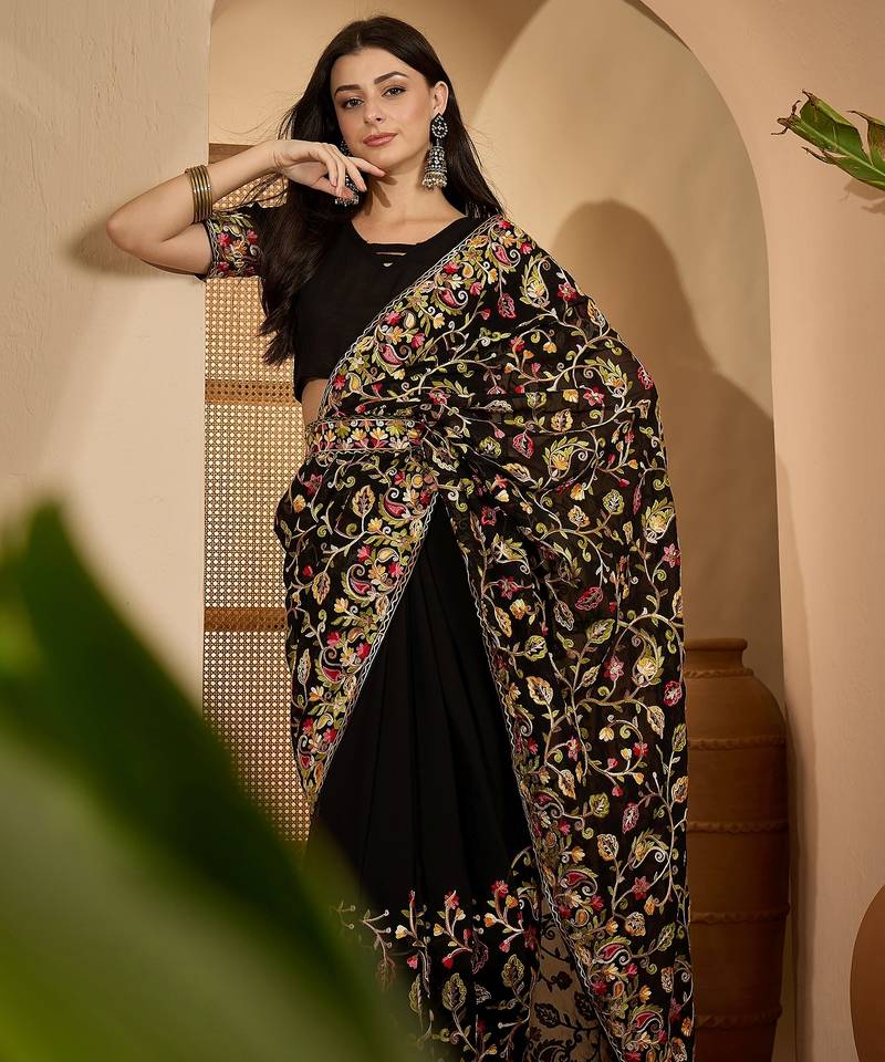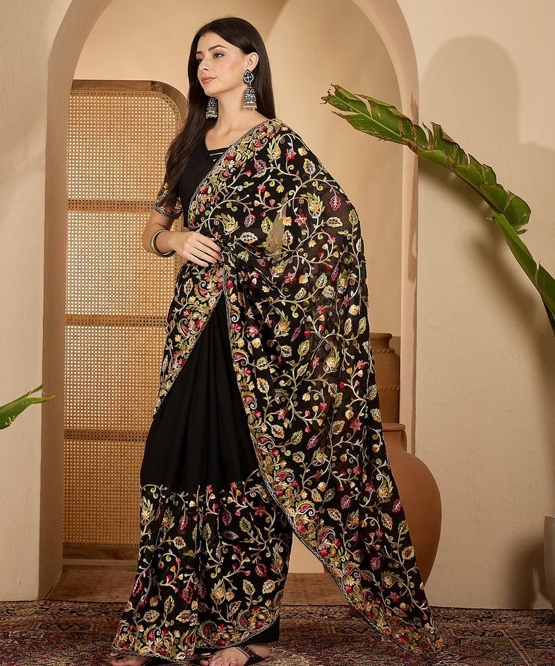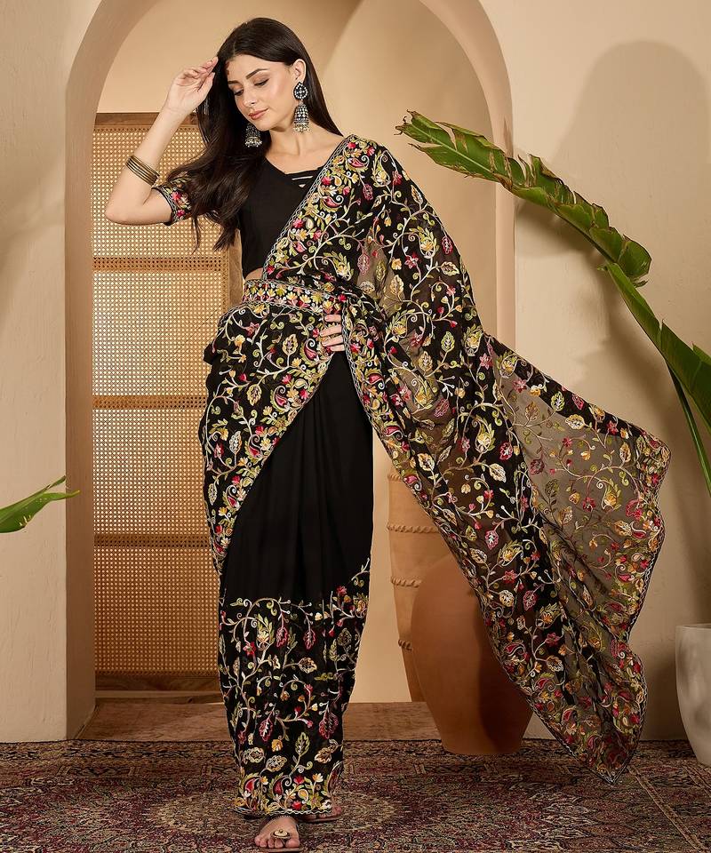 | Product Name | Black Georgette Heavy Embroidered Saree With Belt Kashmiri Thread Work Festive Designer Saree | |