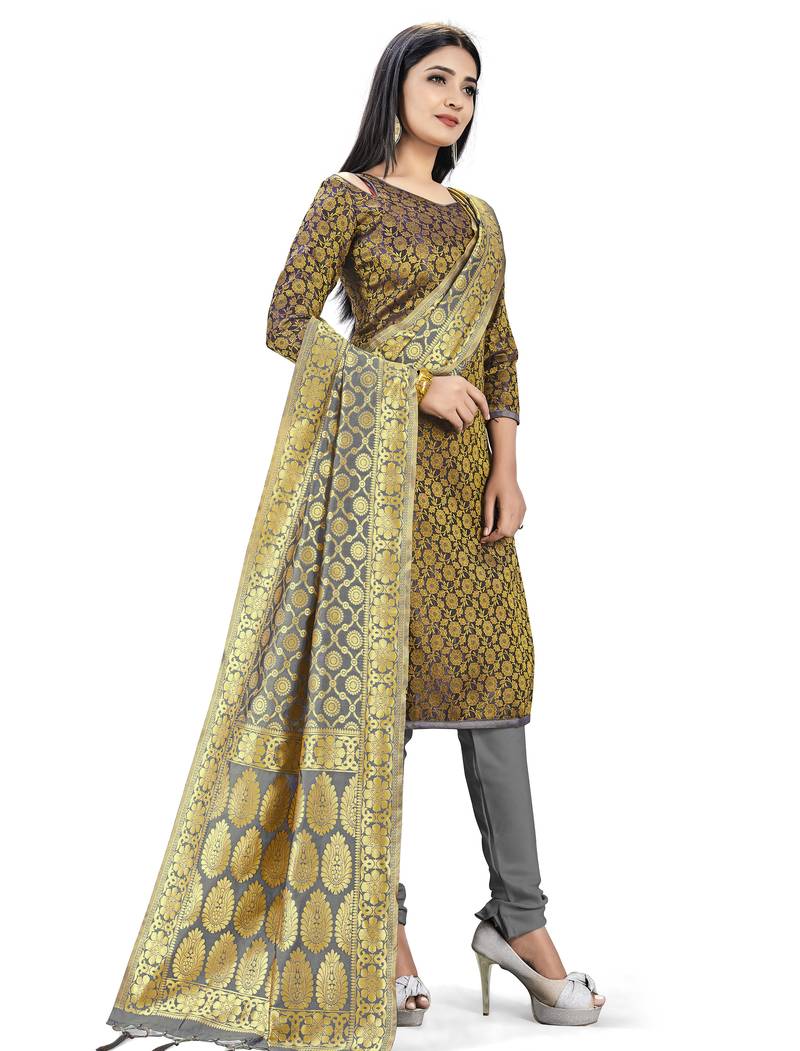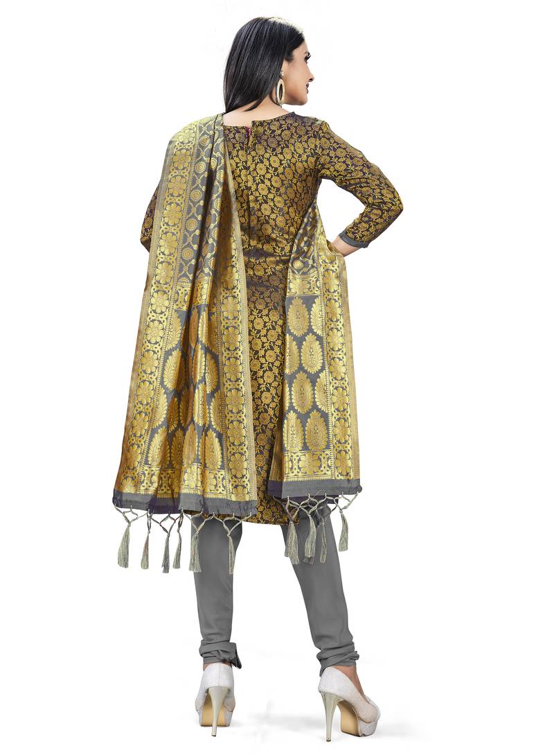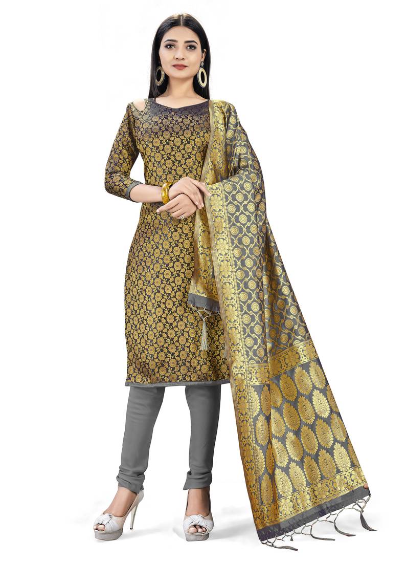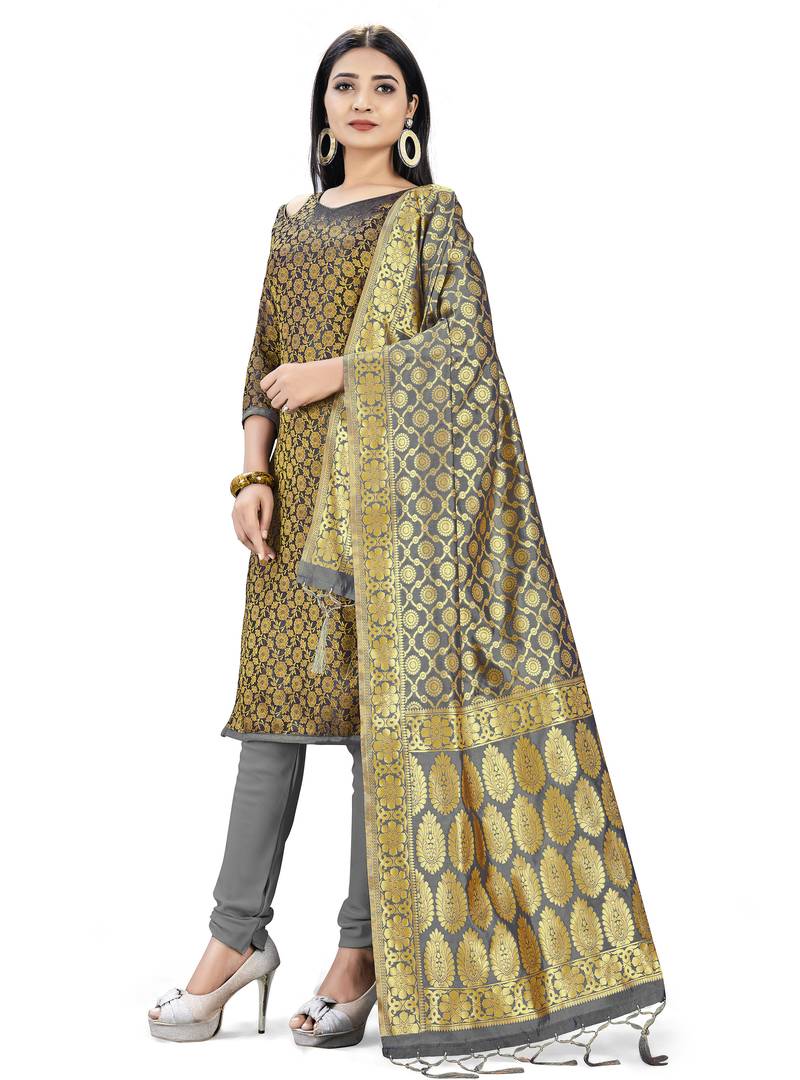 | Product Description | Beautifull Heavy Designer All Over Small Flower Butti Jall Patern Weaving Work Top With Fancy Stall Dupatta Of Weaving And Jalar Work Straight Style 2 Mtr Unstitched Dress Material Top Of Black Colour Banarasi Silk Fabric Suggestable Quarter Style Sleeves And Round Style Neck Also Including 2.30 Mtr Chudidar Style Bottom Piece Material Of Grey Colour Silk Blend Fabric With 2.25 Mtr Dupatta Of Grey Colour Banarasi Silk Fabric By Shadow & Saining Brand |