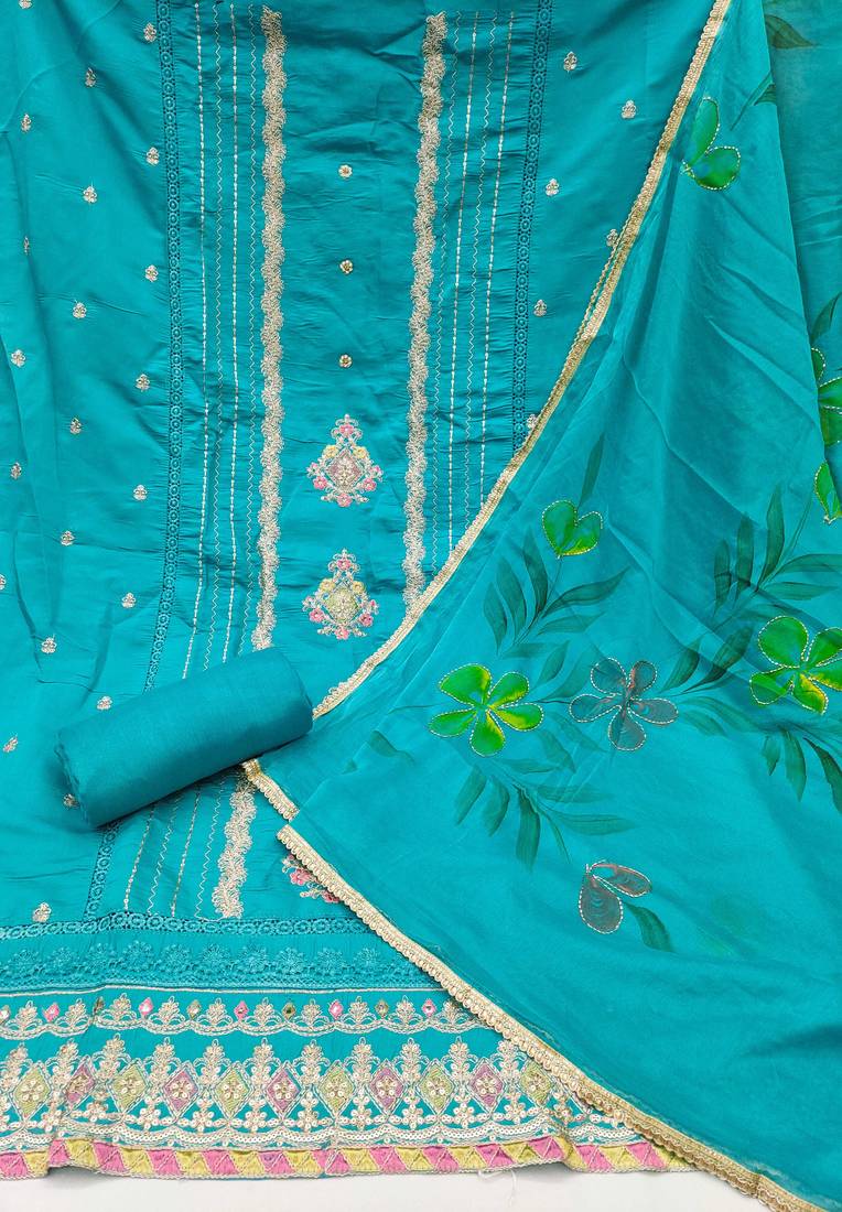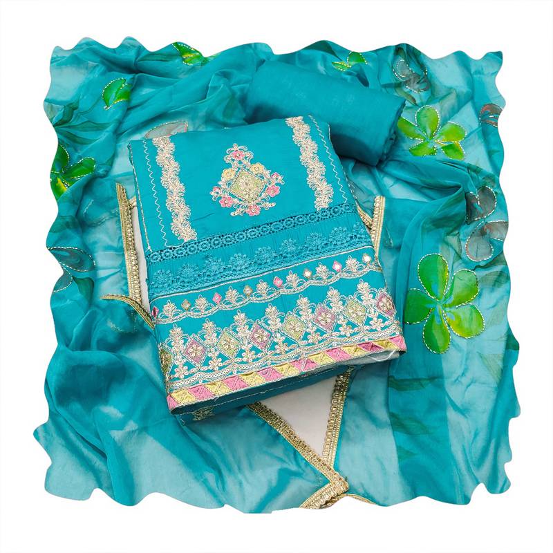 | Product Description | Easy Care Heavy Embroidery And Fancy Border With Designer Digital Printed Dupatta Straight Style 2.20 Mtr Unstitched Dress Material Top Of Blue Colour Premium Roman Cotton Fabric Also Including 2.40 Mtr Chudidar Style Bottom Piece Material Of Blue Colour Rayon Fabric With 2.10 Mtr Dupatta Of Blue Colour Nazneen Fabric By Shadow & Saining Brand |