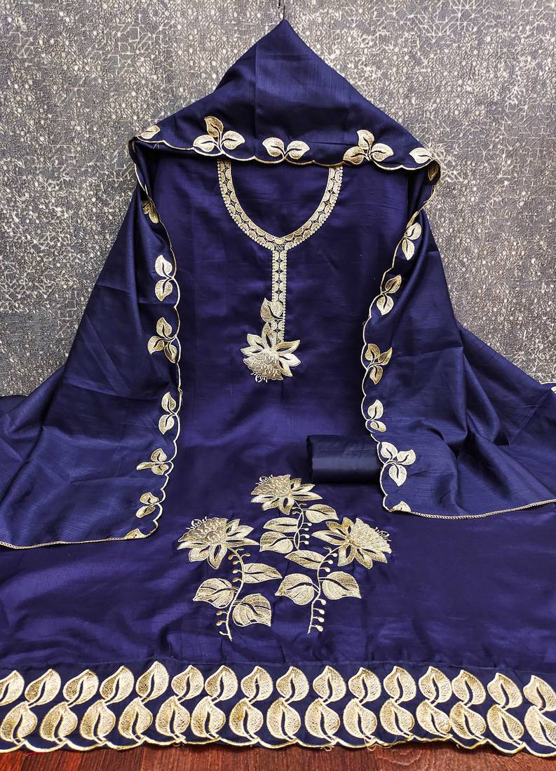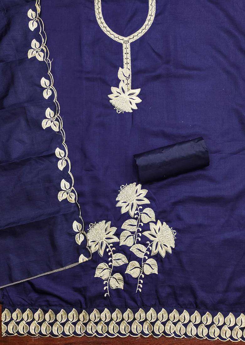 | Product Description | Statement Heavy Thread Embroidery And Fancy Border With Designer Embroidered Dupatta Straight Style 2.00 Mtr Unstitched Dress Material Top Of Blue Colour Cotton Fabric Also Including 2.20 Mtr Chudidar Style Bottom Piece Material Of Blue Colour Cotton Fabric With 2.00 Mtr Dupatta Of Blue Colour Cotton Fabric By Shadow & Saining Brand |