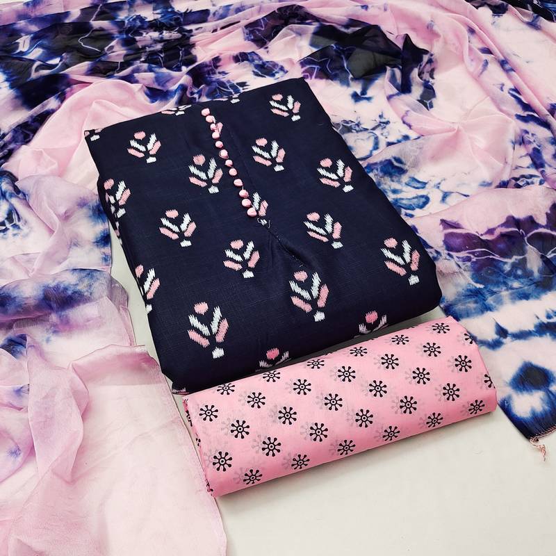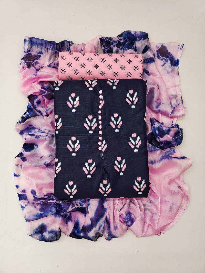 | Product Description | Simplistic Print Straight Style 1.80 Mtr Unstitched Dress Material Top Of Blue Colour Slub Cotton Fabric Also Including 2.00 Mtr Chudidar Style Bottom Piece Material Of Baby Pink Colour Cotton Fabric With 2.00 Mtr Dupatta Of Multi Colour Chinnon Fabric |