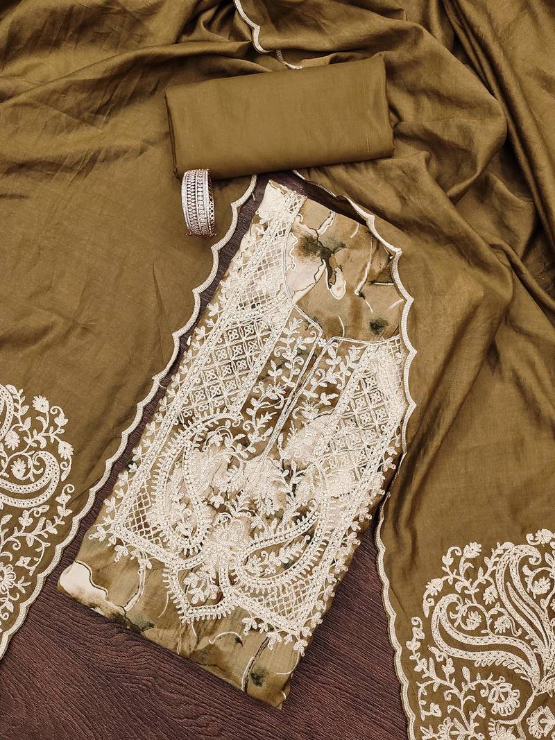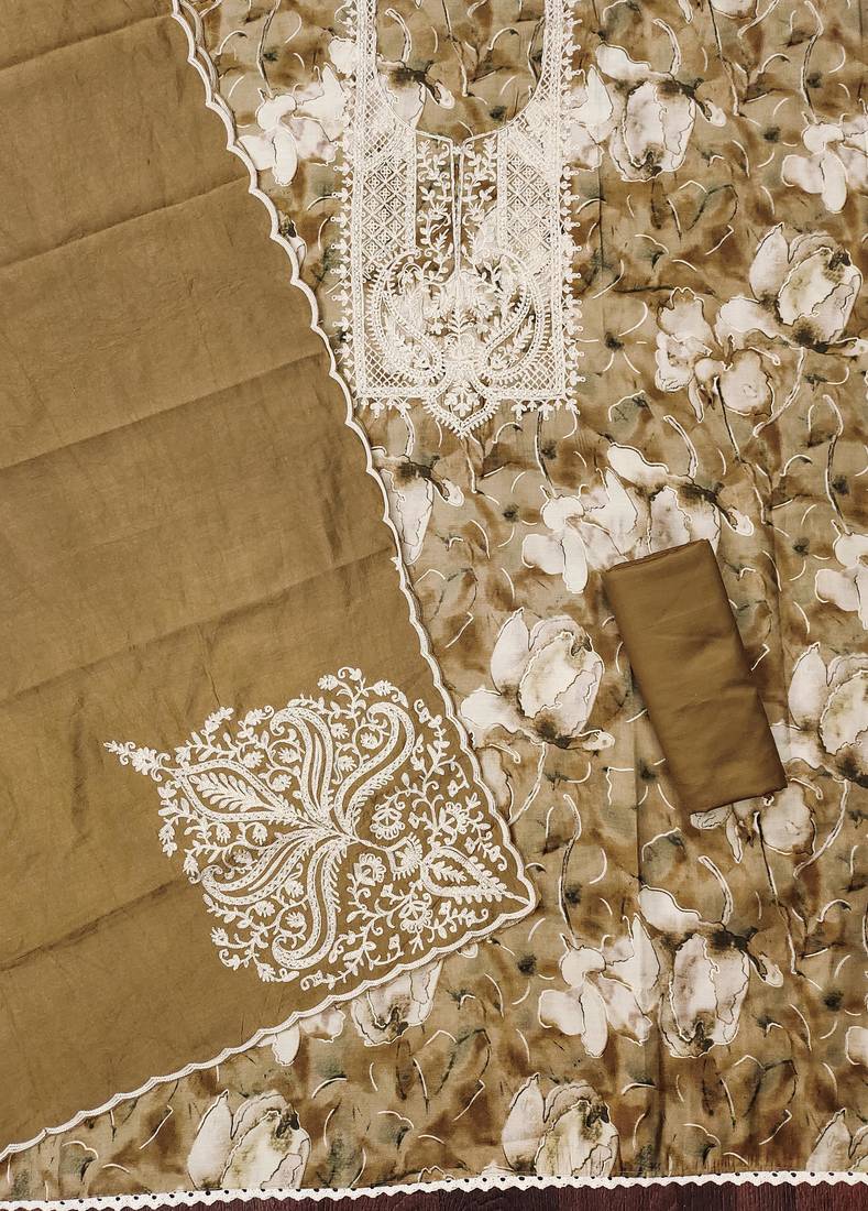 | Product Description | Stylish Foil Printed And Designer Neck Thread Embroidery Work Along Handwork With Embroidered Dupatta Work Straight Style 2.30 Mtr Unstitched Dress Material Top Of Caramel Brown Colour Pure Modal Cotton Fabric Also Including 2.50 Mtr Chudidar Style Bottom Piece Material Of Caramel Brown Colour Heavy Santoon Fabric With 2.30 Mtr Dupatta Of Caramel Brown Colour Heavy Chanderi Cotton Fabric By Shadow & Saining Brand |