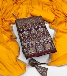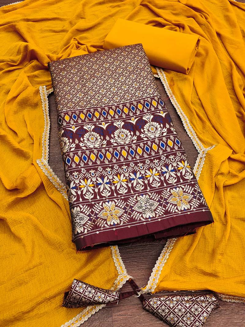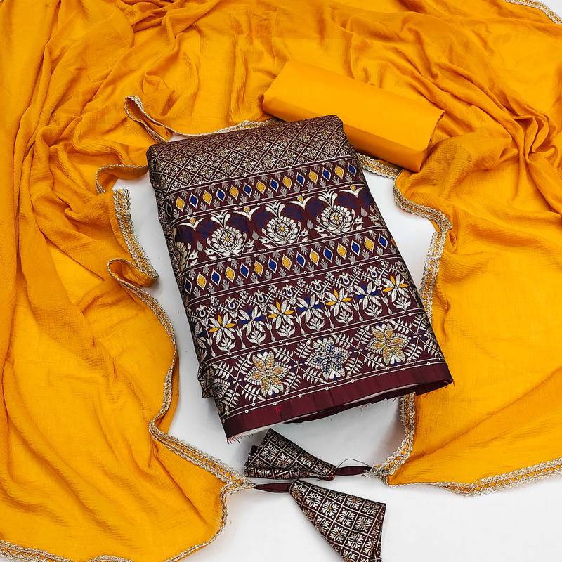 | Product Description | Fancy Heavy Zari Weaving Work With Banarasi Jacquard Multi Mina Woven Work Along With Lace Work Dupatta Straight Style 2.00 Mtr Unstitched Dress Material Top Of Coffee Brown Colour Banarasi Jacquard Fabric With 2 Mtr Silk Blend As Lining Inner Fabric Also Including 2.10 Mtr Unstiched Bottom Material Of Mustard Colour Cotton Blend Fabric With 2.10 Mtr Dupatta Of Mustard Colour Nazneen Fabric By Shadow & Saining Brand |