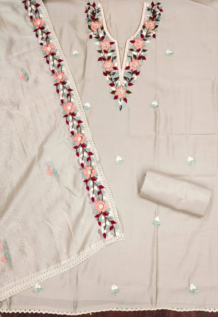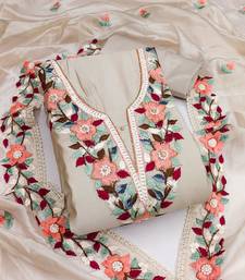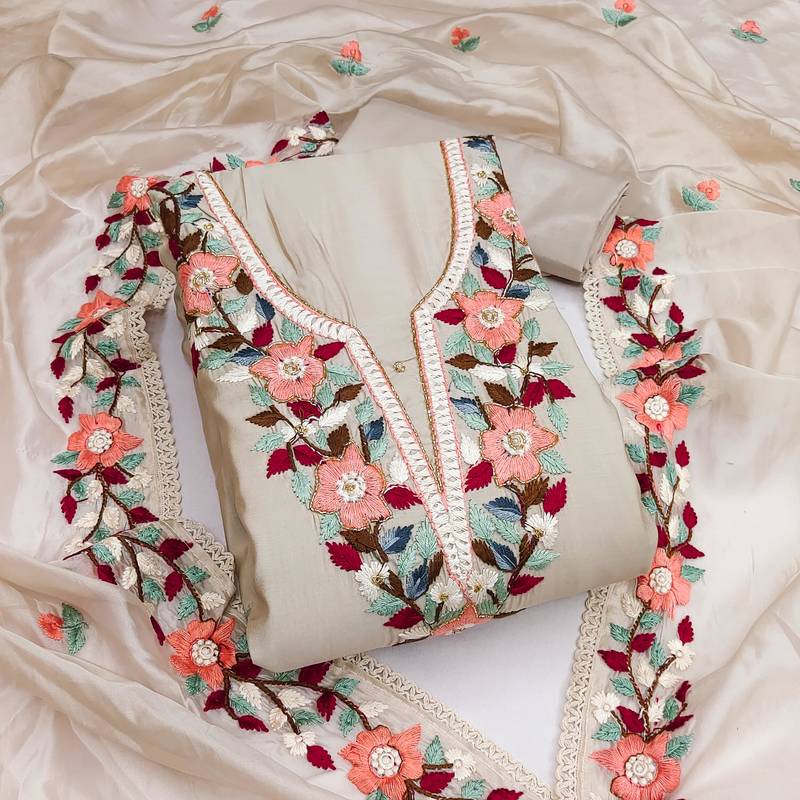 Cream color thread work heavy roman silk straight churidar dress material semi stitched