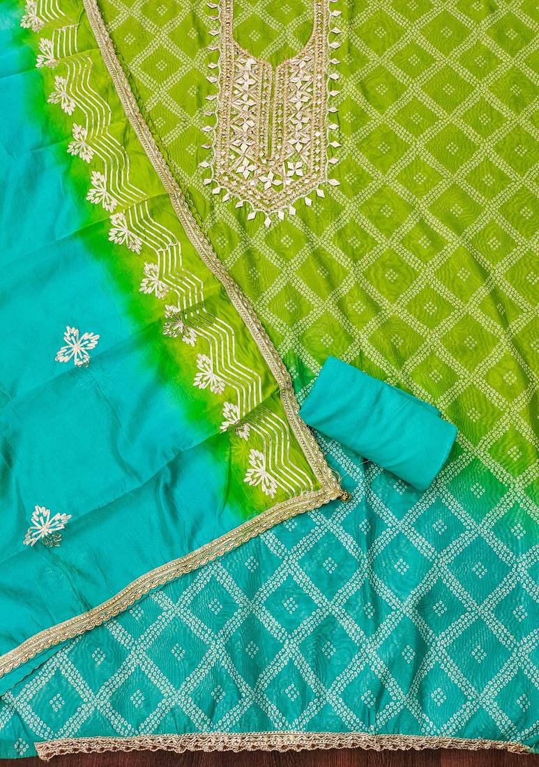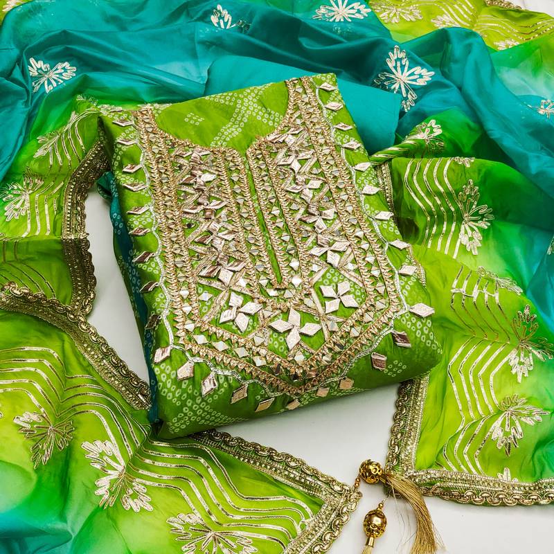 | Product Description | Stylish Bandhani Leheriya Digital Print With Heavy Gota Patti Neck Work With Border Work Along Designer Gota Pati With Digital Printed Dupatta Work Straight Style 2.40 Mtr Unstitched Dress Material Top Of Green Colour Heavy Organza Fabric Also Including 2.50 Mtr Chudidar Style Bottom Piece Material Of Blue Colour Reyon Fabric With 2.40 Mtr Dupatta Of Multi Colour Heavy Organza Fabric By Shadow & Saining Brand |