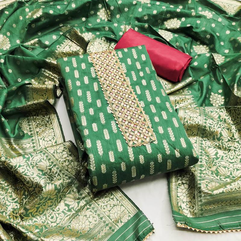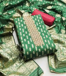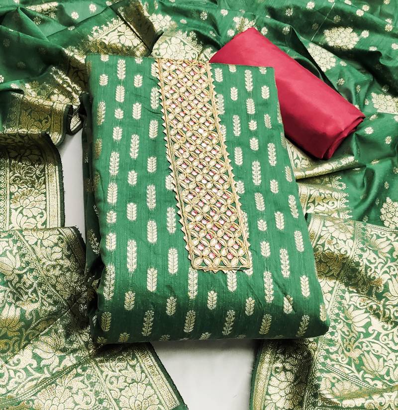 Green color weaving banarasi jacquard straight churidar dress material semi stitched
