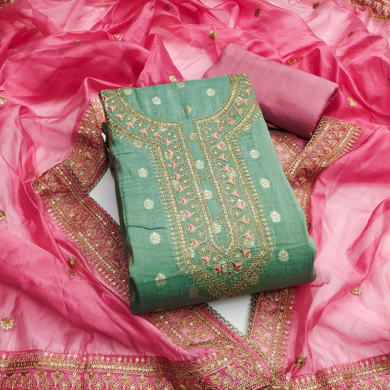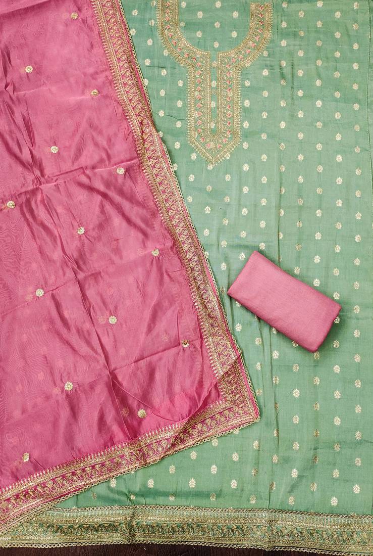 | Product Description | Designer Jari Weaving Work With Fancy Embroidery Work And Heavy Embroidery With Stylish Border Dupatta Work Straight Style 2.40 Mtr Unstitched Dress Material Top Of Green Colour Simmer Silk Fabric Also Including 2.50 Mtr Chudidar Style Bottom Piece Material Of Pink Colour Reyon Fabric With 2.40 Mtr Dupatta Of Pink Colour Heavy Organza Fabric By Shadow & Saining Brand |