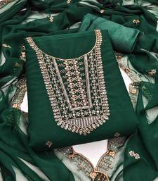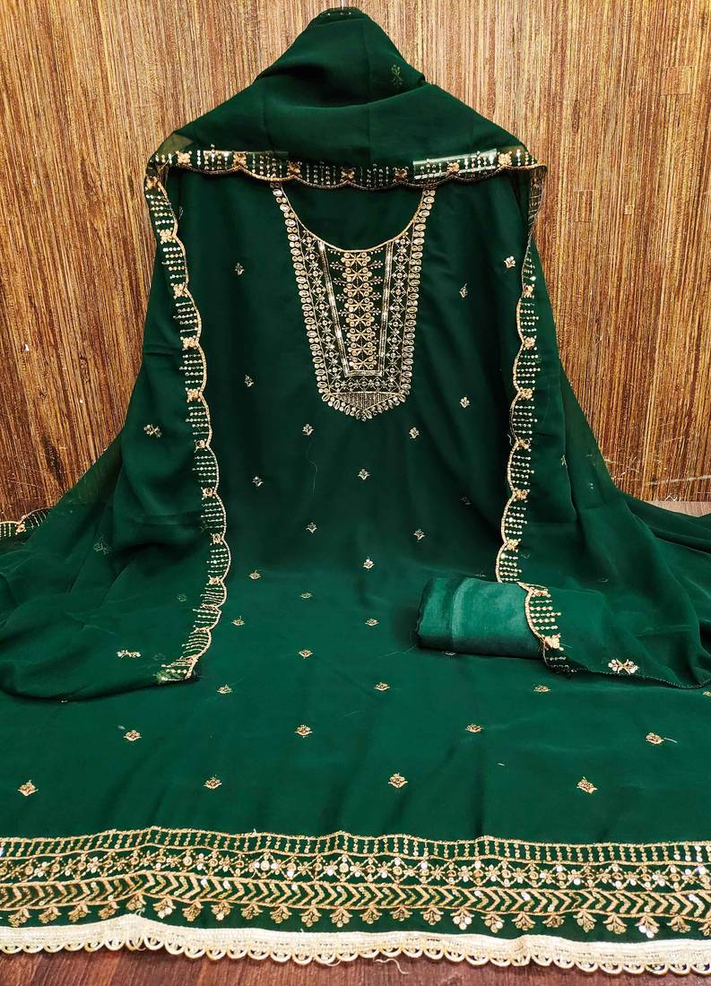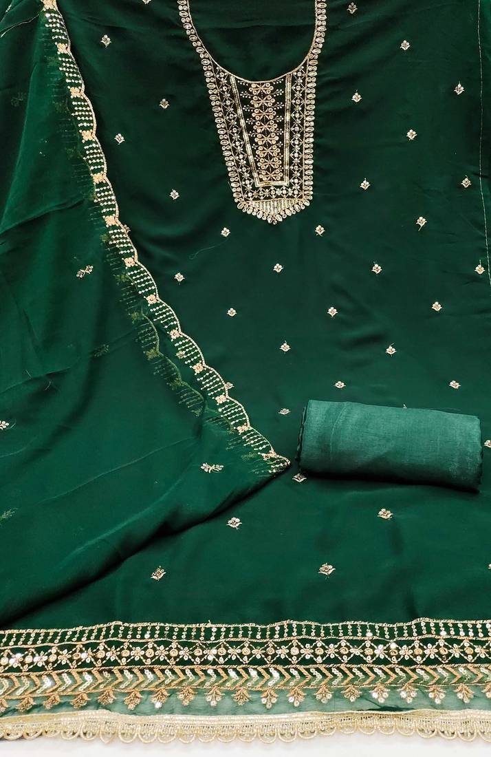 Classic Heavy Zari Sequence Embroidery And Fancy Border With Embroidered Dupatta Straight Style 1.80 Mtr Unstitched Dress Material Top Of Green Colour Georgette Fabric With 2 Mtr Santoon As Lining Inner Fabric Also Including 3.60 Mtr Unstiched Bottom Material Of Green Colour Santoon Fabric With 2.10 Mtr Dupatta Of Green Colour Georgette Fabric By Shadow & Saining Brand