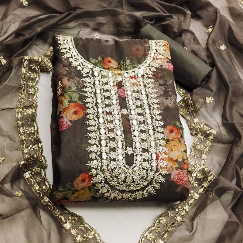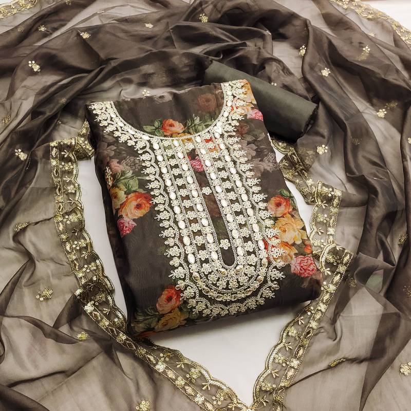 | Product Description | Awesome Stylish Handwork, Designer Digital Print And Fancy Border With Heavy Embroidered Dupatta Work Straight Style 2.15 Mtr Unstitched Dress Material Top Of Grey Colour Heavy Organja Fabric With 2 Mtr Heavy Santoon As Lining Inner Fabric Also Including 3.80 Mtr Unstiched Bottom Material Of Grey Colour Heavy Santoon Fabric With 2.10 Mtr Dupatta Of Grey Colour Heavy Organja Fabric By Shadow & Saining Brand |