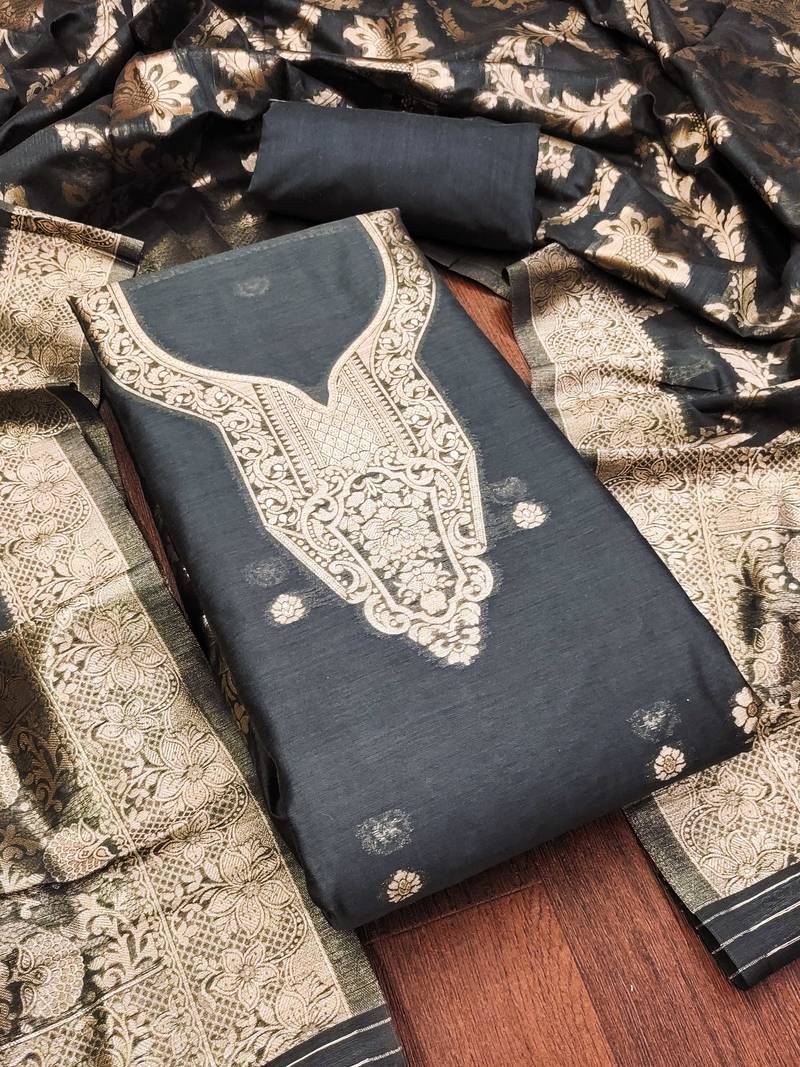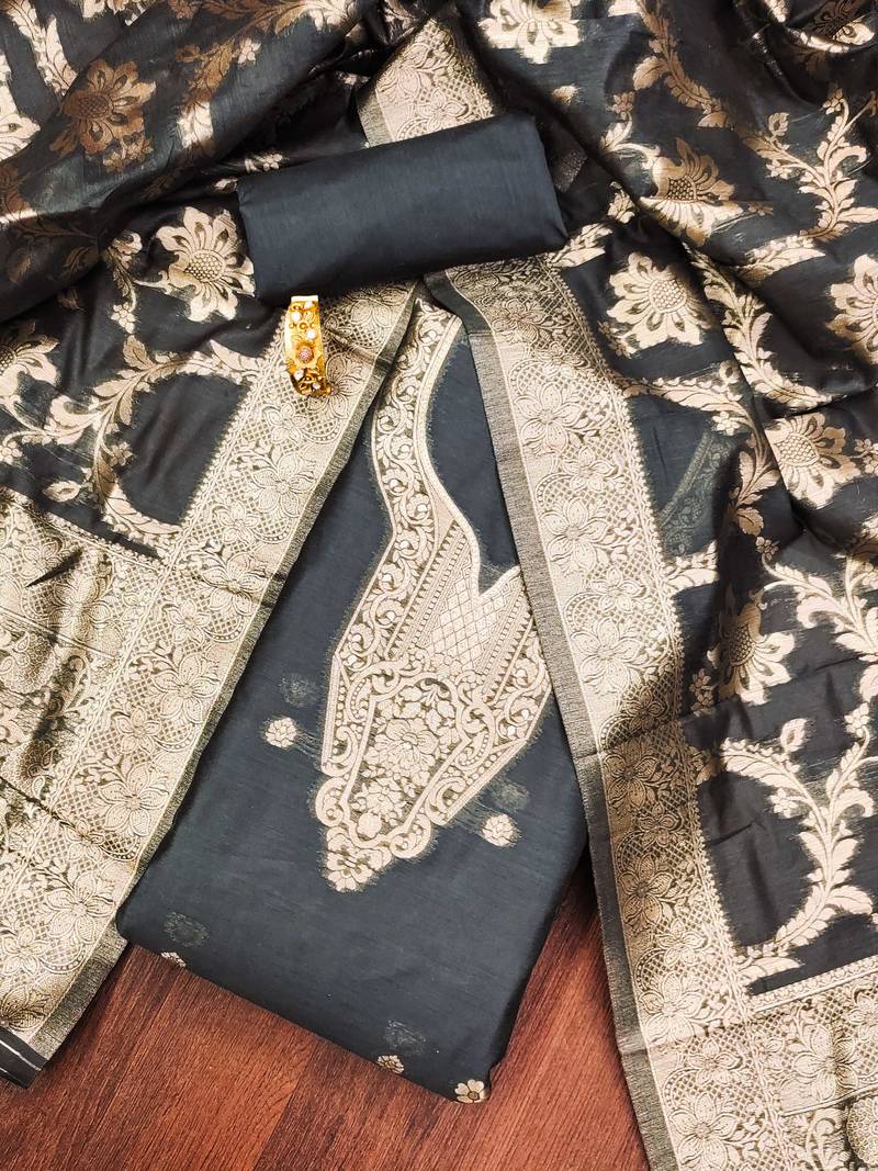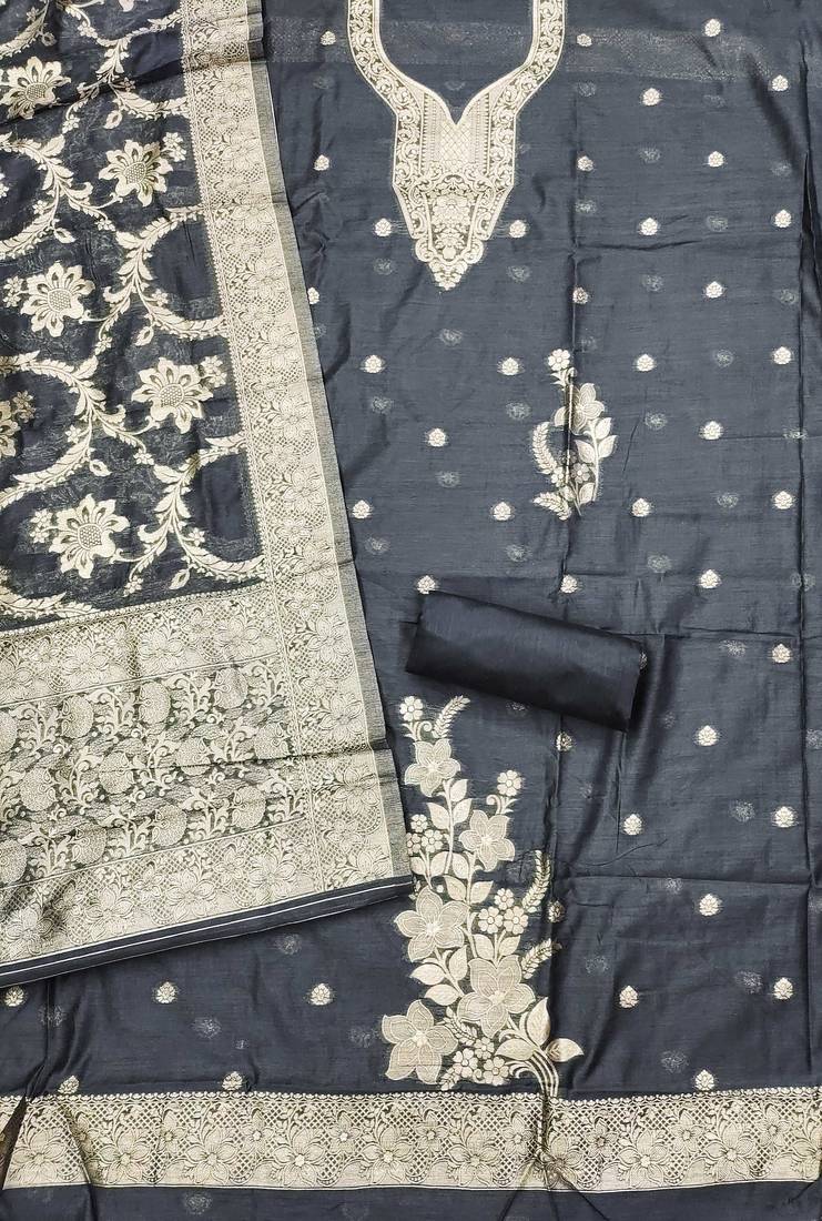 | Product Description | Designer Heavy Zari Weaving Work With Heavy Neck And Banarasi Jacquard Woven Work Dupatta Straight Style 2.00 Mtr Unstitched Dress Material Top Of Grey Colour Spun Cotton Fabric Also Including 2.00 Mtr Chudidar Style Bottom Piece Material Of Grey Colour Cotton Fabric With 2.25 Mtr Dupatta Of Grey Colour Cotton Jacquard Fabric By Shadow & Saining Brand |