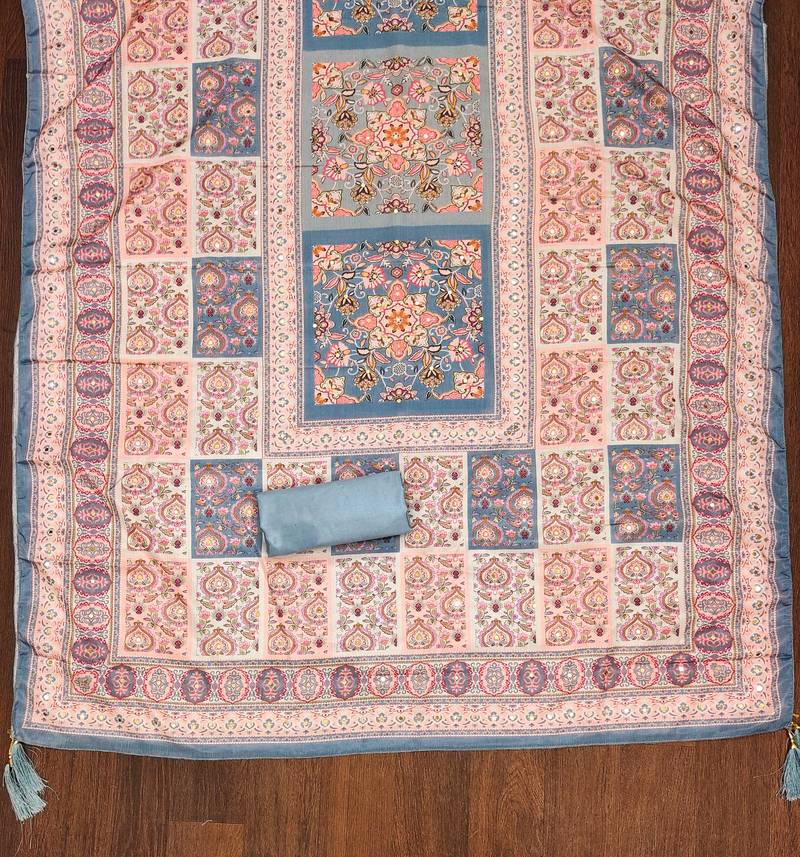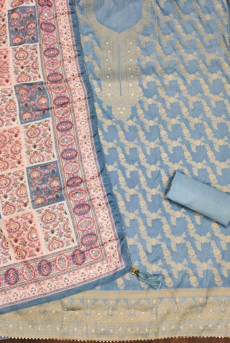 | Product Description | Stylish Heavy Jari Weaving Work With Fancy Neck And Stylish Digital Print And Mirror Work Dupatta Straight Style 1.95 Mtr Unstitched Dress Material Top Of Grey Colour Banarasi Jacquard Fabric With 2 Mtr Heavy Santoon As Lining Inner Fabric Also Including 3.70 Mtr Unstiched Bottom Material Of Grey Colour Heavy Santoon Fabric With 2.20 Mtr Dupatta Of Multi Colour Chinon Silk Fabric By Shadow & Saining Brand |
