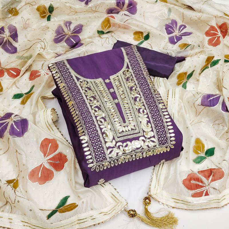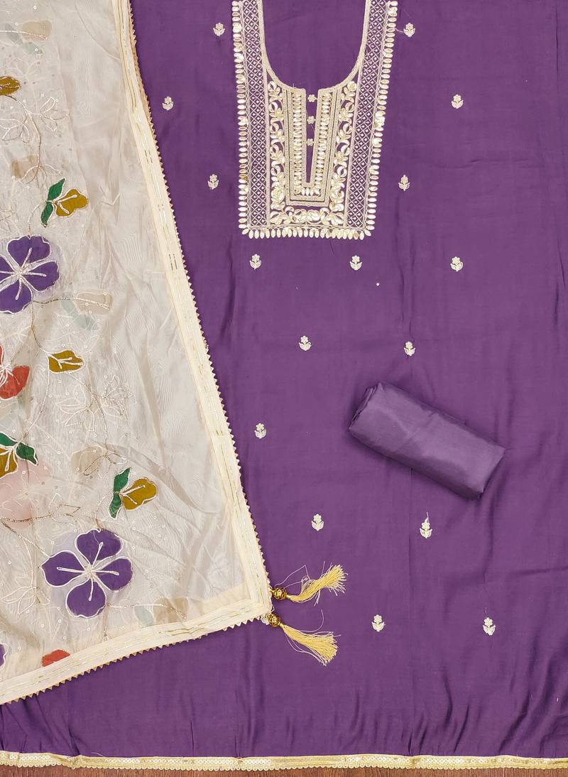 | Product Description | Stylish Heavy Embroidery Work Top With Fancy Sequence And Digital Print Dupatta Work Straight Style 2.20 Mtr Unstitched Dress Material Top Of Lavender Colour Heavy Roman Silk Fabric Also Including 2.40 Mtr Chudidar Style Bottom Piece Material Of Lavender Colour Heavy Santoon Fabric With 2.20 Mtr Dupatta Of Cream Colour Heavy Organza Fabric By Shadow & Saining Brand |