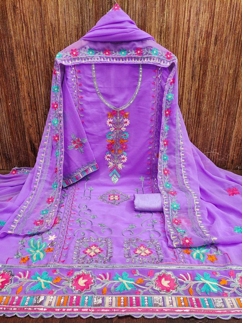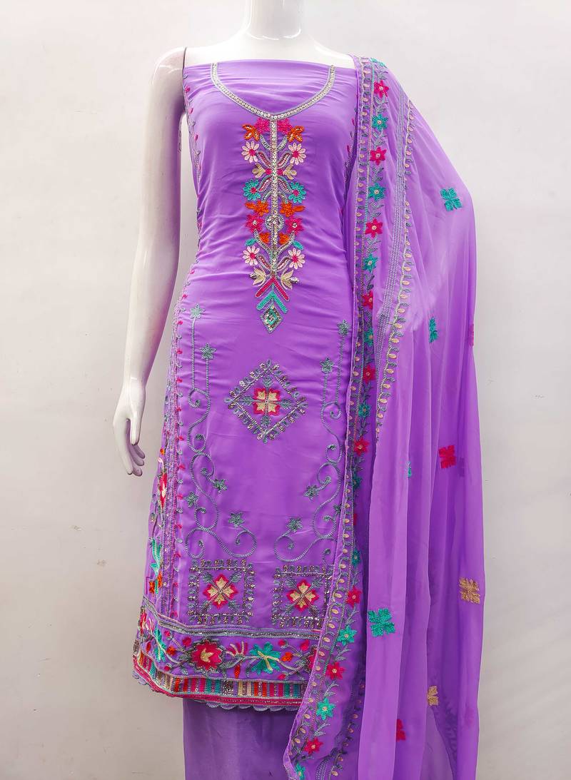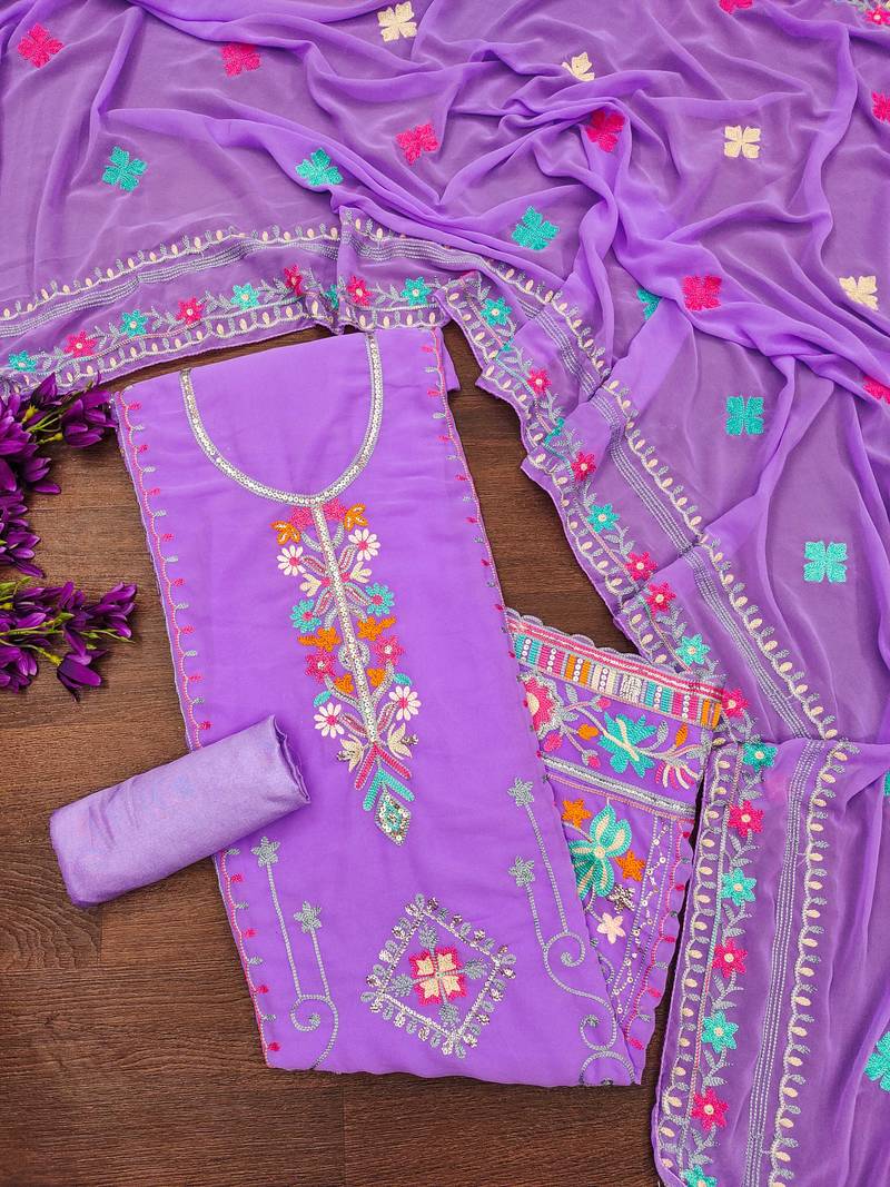 Lavender georgette embroidered dress material unstitched