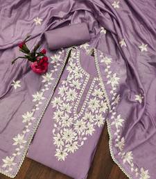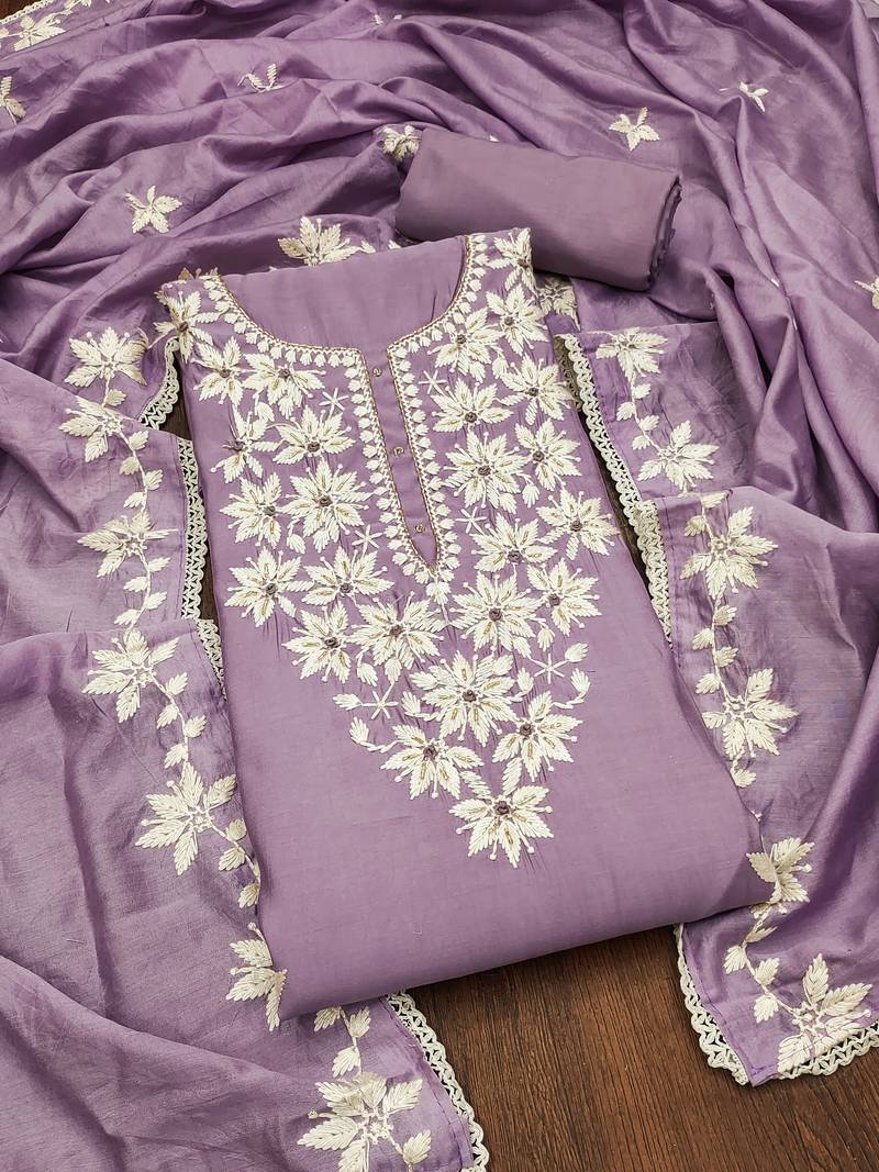 Lavender thread embroidery silk blend semi stitched churidar dress-materials