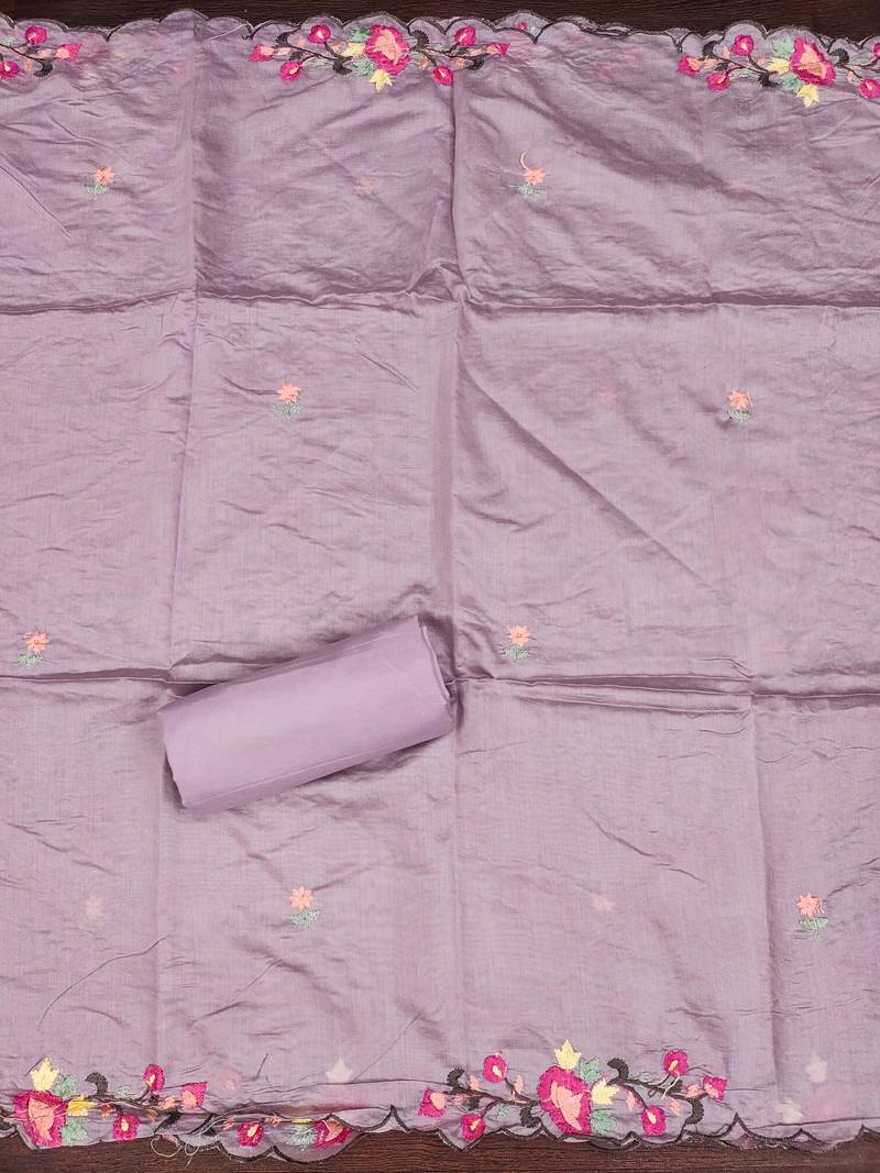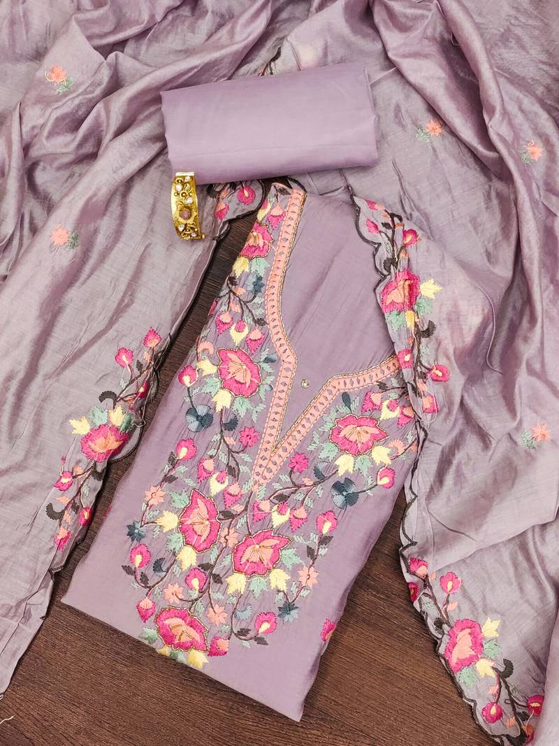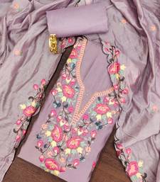 Lavender thread embroidery silk blend semi stitched churidar dress-materials