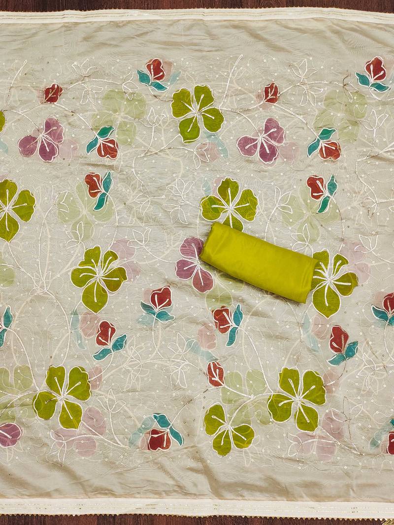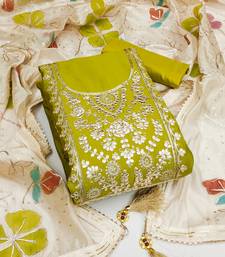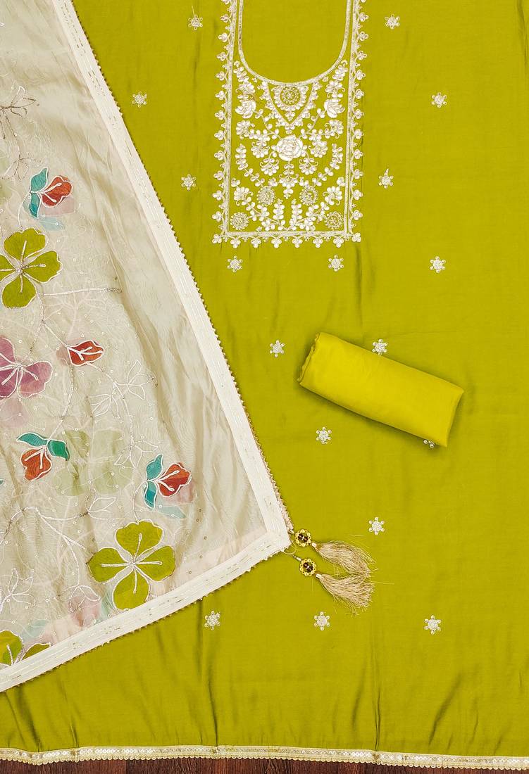 Lime color embroidered heavy roman silk straight churidar dress material semi stitched